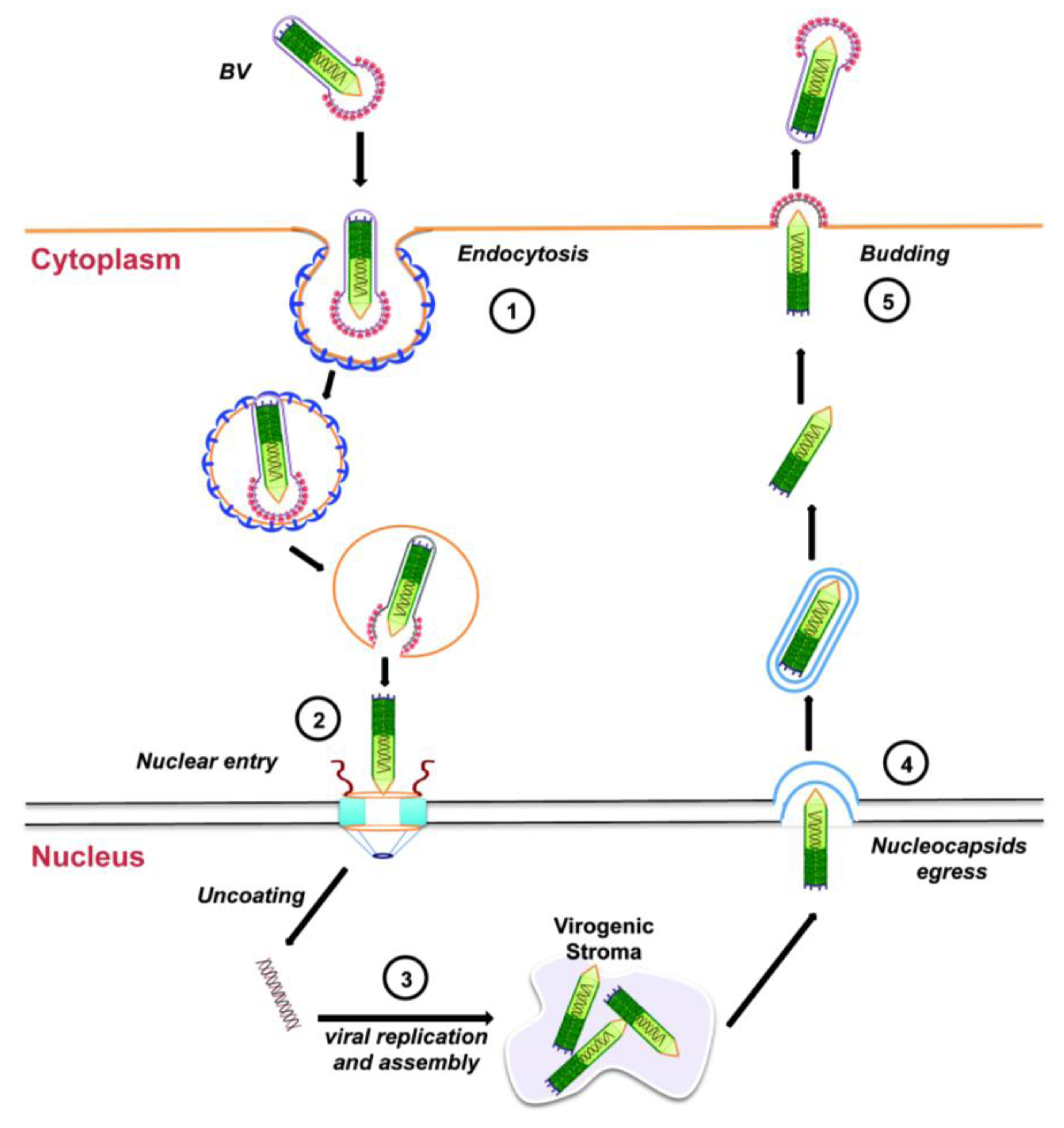 Entry of the BV form of AcMNPV into tissue-cultured cells is through endocytosis (Figure 3, step 1). Upon acidification of the endosome, the endosomal membrane fuses with the viral envelope, resulting in the release of the nucleocapsid into the cytoplasm, which is then transported towards the nucleus using actin polymerization (Figure 3, step 2; see Section 3.2 below). Next, the viral DNA is released into the nucleus and viral replication begins with the formation of the virogenic stroma near the center of the nuclei of infected cells (Figure 3, step 3). This is the site of transcription and replication of viral DNA, and nucleocapsid assembly. During the early phase of replication (from 0 through 6 to 9 h after infection), genes essential for viral DNA replication are transcribed. DNA replication, followed by nucleocapsid assembly, occurs during the late phase of replication (between 6 to 18 h after infection). Progeny nucleocapsids leave the nucleus (Figure 3, step 4), acquiring an envelope from the nuclear membranes that is eventually lost. These nucleocapsids finally travel to the plasma membrane where they bud off acquiring a glycoprotein-rich envelope from the cell membrane to generate BVs (Figure 3, step 5). These BVs cause systemic infection by infecting neighboring cells and the infectious cycle begins again.