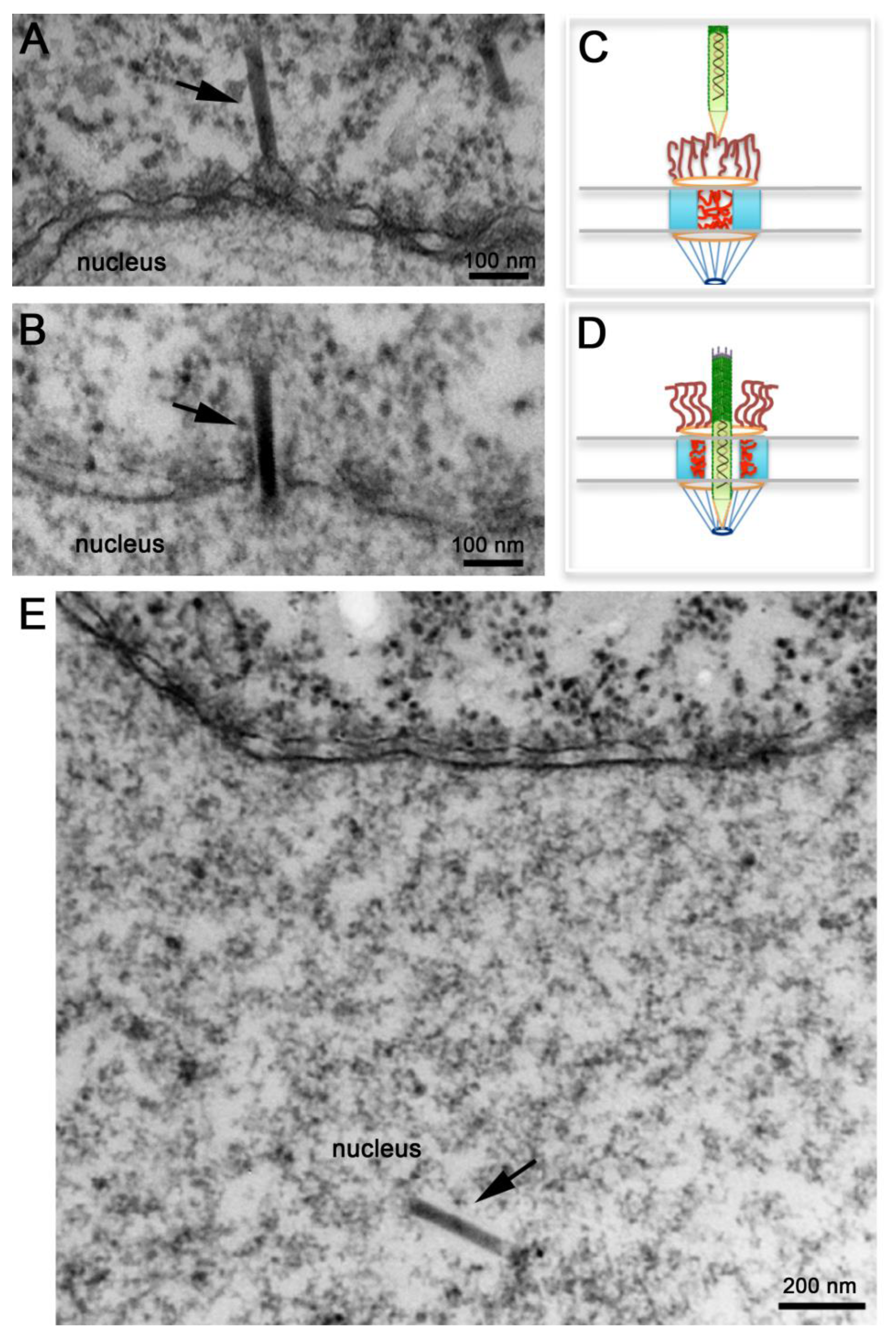 Transport of an intact AcMNPV nucleocapsid through the NPC was also confirmed by electron tomography, and a remarkable 3D image of a nucleocapsid in the midst of crossing the NPC was published [62]. Noticeable NPCs not engaged in nucleocapsid nuclear transport or those with nucleocapsids docked to their cytoplasmic filaments appear electron-dense (Figure 4A), as if nucleoporins residing within this gate prohibit the passage of the nucleocapsid (Figure 4C). Presumably cellular receptors or signaling events that are yet unknown function as the magical phrase ‘Open, Sesame’ that notifies nucleoporins in the central channel to move towards the body of the NPC unlocking this gate and leaving the NPC in an ‘open’ state that allows the nucleocapsid to get across it (Figure 4D). Moreover, such an unlocked mechanism seems to completely open up the NPC central gate so that an apparent space or a less electron-dense area of about 10 nm was detected around the nucleocapsid in electron micrographs and electron tomograms of nucleocapsids that were in the middle of NPCs [62]. Even the NPC cytoplasmic filaments, which usually have a kinky appearance in electron micrographs [66], appear straightened out (compare the short filaments emanating from the NPC into the cytoplasm in Figure 4A,B). It appears that the NPC cytoplasmic filaments and nucleoporins residing in the NPC central channel re-localize to clear out the entire passageway for the rod-shaped nucleocapsid to traverse the NPC and enter the nucleus (Figure 4D).