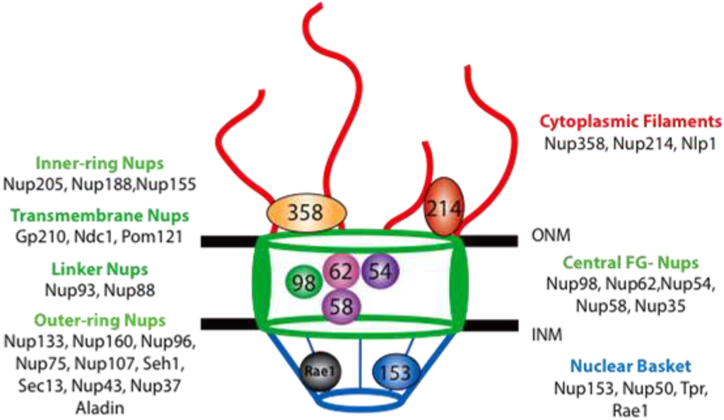The nuclear pore complex (NPC). Schematic representation of a cross-section view of a NPC as it spans the inner (INM) and outer (ONM) nuclear membranes. Vertebrate Nups are listed based on their localization within the NPC. The central core (green) is composed of the inner-ring Nups, transmembrane Nups, linker Nups, outer-ring Nups and the phenylalanine-glycine (FG)-Nups. The location of select nucleoporins within the NPC is shown.
