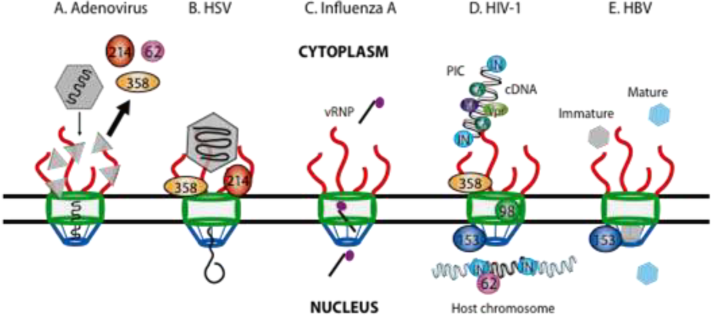 Viruses that hijack the nuclear pore complex to promote viral genome nuclear import. Schematic representations of the different mechanisms by which 5 viruses subvert various Nups in order to facilitate nuclear import. (A) Uncoating of the adenovirus capsid at the NPC causes at once the release of the DNA genome into the nucleus and displacement of Nup62, Nup214 and Nup358 into the cytoplasm. (B) HSV-1 capsid docking to cytoplasmic filaments leads to uncoating and driving the DNA genome through the NPC. (C) Import of the influenza A virus vRNP is mediated by the classical importin α/β transport pathway. (D) The HIV-1 PIC (pre-integration complex) docks to Nup358 before being imported into the nucleus and integrated into the host chromosome in the process that is facilitated by Nup62, Nup98 and Nup153. (E) Mature and immature HBV capsids are imported intact through the NPC, however; Nup153 ensures that only mature capsids disintegrate to release the DNA genome into the nucleus.
