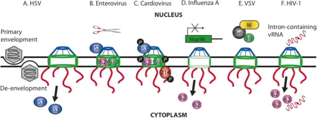 Changes to the NPC by viruses during nuclear export. Schematic representations of the different mechanisms by which 6 viruses subvert various Nups in order to facilitate nuclear export. (A) HSV-1 capsids exit the nucleus via a process of primary envelopment and de-envelopment. Secondary effects include dilation of the NPC channel and redistribution of Nup153. (B) Enteroviruses replicate in the cytoplasm and induce degradation of Nup62, Nup98 and Nup153 by the protease 2Apro (scissors). (C) Cardiovirus infection induces hyperphosphorylation (P) of Nup62, Nup98, Nup153 and Nup214. (D) Influenza A downregulates the expression of Nup98 and relocalizes Nup62 to the cytoplasm. (E) VSV M protein inhibits mRNA export through an interaction with the Rae1-Nup98 complex in the nucleoplasm. (F) HIV-1 Rev-mediated vRNA export is CRM1-dependent and causes the displacement of Nup62 into the cytoplasm.