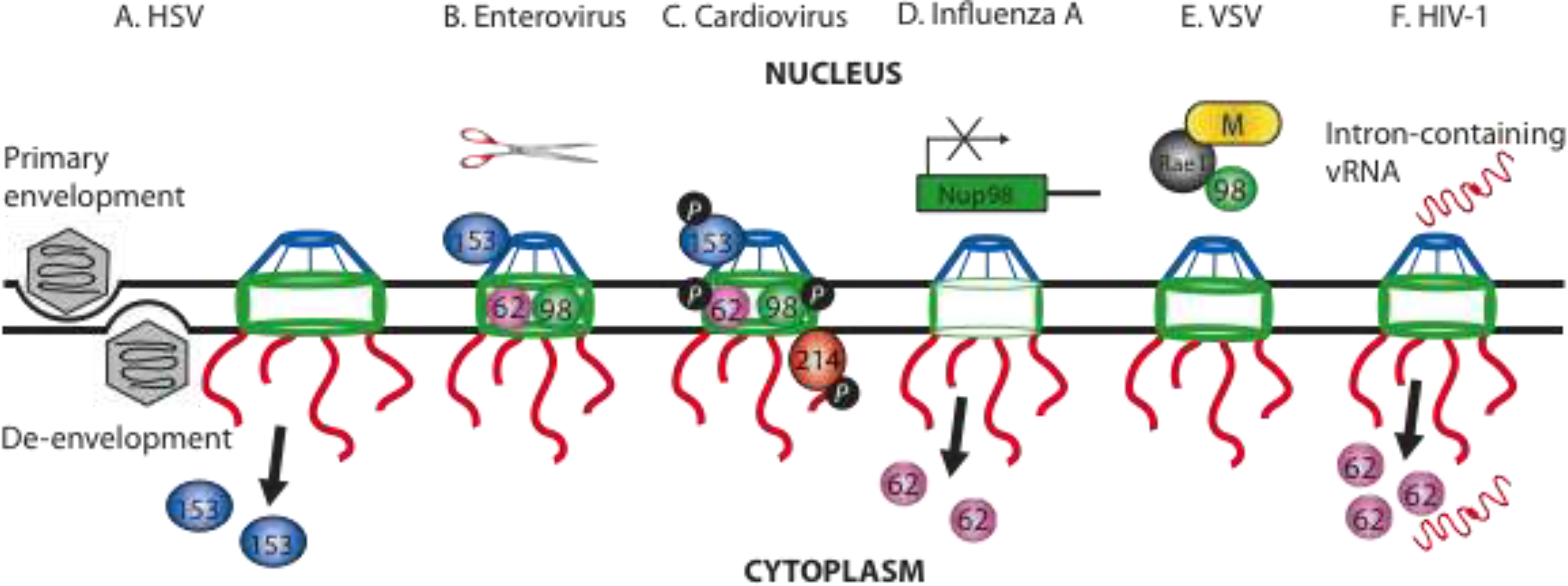 | Cardiovirus | Nup62 | Blocks host import/export | Immunoblot analysis of phosphorylation | [29] |