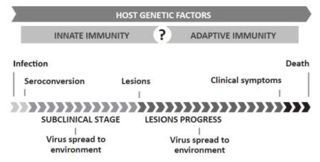 Small Ruminant Lentivirus (SRLV) timeline. SRLVs are transmitted via the respiratory or lactogenic route. Proviral DNA transcription and gene expression is suppressed until infected monocytes mature into macrophages. Once in the target organs, infected macrophages initiate viral replication, which induces an inflammatory cascade. Despite a vigorous immune response, the virus is not cleared and the animal will remain a carrier for life. Most animals remain asymptomatic, but a certain percentage of the animals develop the clinical disease in one or several target organs. Subclinical infection and disease progression may range from months to years. Both Visna/Maedi (VM) and Caprine Arthritis-Encephalitis (CAE) are ultimately fatal. Host genetic factors, infecting viral strain and management influence the occurrence, length and spectrum of affected target organs.