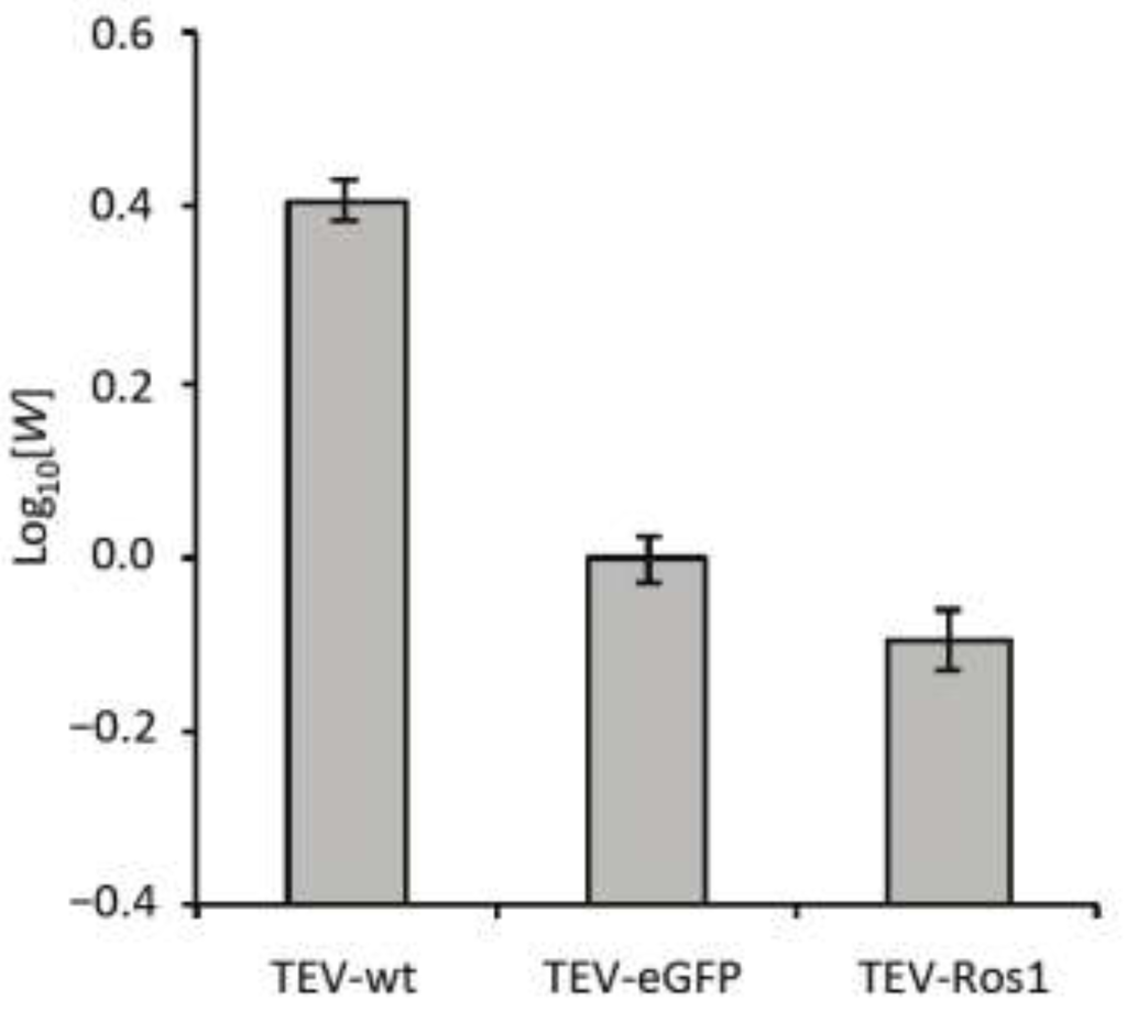 We quantified the within-host competitive fitness (W; see Section 3.5) of wild-type TEV (TEV-wt) [11], TEV-Ros1 and TEV-eGFP in N. tabacum using TEV-mCherry [8] (a similar virus variant carrying the fluorescent protein mCherry in0 between the P1 and HC-Pro cistrons) as a common competitor (Figure 3).