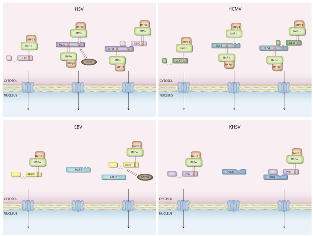 Answering these questions is not only important for fundamental understanding of herpesviral biology, but also for the development of urgently needed antiviral drugs to fight herpesvirus infections. Inhibition of IMPα/β mediated nuclear import has been recently shown to impair both HIV-1 and DENV replication [89,90]; since several crucial herpesviral proteins are dependent on IMPα/β for transport to the nucleus, it seems highly likely that pharmacological targeting of IMPα/β may impact on herpesvirus production. Along the same lines, it is possible that inhibition of kinases phosphorylating the C-terminus of HCMV PAP, including CK2, may result in impaired HCMV replication, by impairing PAP nuclear import. Finally, Hsp90 inhibitors may represent a novel class of anti-herpetic drugs able to block nuclear import of several DNA replicating machinery proteins. Further studies will be required to verify all of these exciting possibilities.