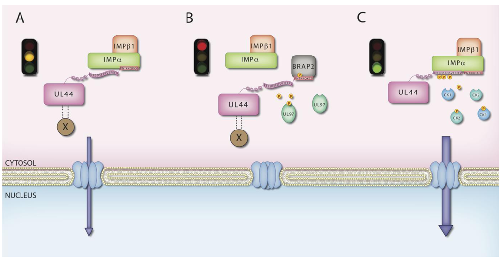 Phosphorylation-regulated nuclear transport of HCMV PAP. HMCV PAP UL44 nuclear import depends on the phosphorylation of its C-terminus. (A) Unphosphorylated UL44 C-terminus can be recognized by the IMPα/β heterodimer with medium affinity. This results in a low rate nuclear import of UL44, possibly enabling interaction with other cytoplasmic factors before import occurs. X indicates either another UL44 molecule, UL54 or the viral uracil DNA glycosylase; (B) Phosphorylation of T427, as mediated by UL97 or cdk1 enables binding to the cytoplasmic retention factor BRAP2, thereby preventing IMPα/β recognition and nuclear targeting. Phosphorylation of S413, S415 and S418 by CK2 and CK1 enhances IMPα/β binding, thereby promoting rapid nuclear import, possibly preventing UL44 to interact with other partners before nuclear import (C).