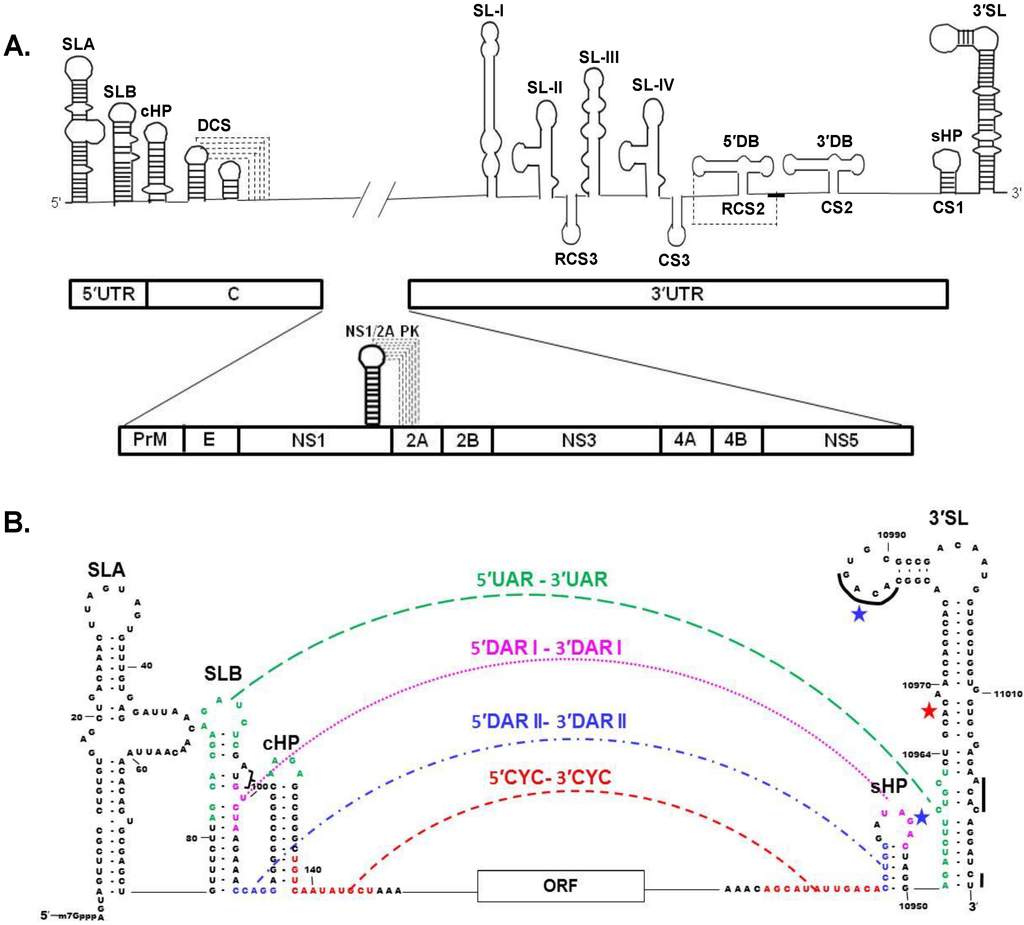 Schematic representations of the West Nile Virus (WNV) genomic RNA. (A) Conserved stem loop (SL) RNA structures located in the 3' and 5' untranslated regions (UTRs) as well as the capsid coding region are shown in the top panel. Pseudoknot interactions are indicated by dotted lines. The positions of the individual virus protein coding regions in the polyprotein ORF are shown in the bottom panel. Viral protein order from the N terminus of the polyprotein: capsid (C), pre-membrane (prM), envelop (E), and the nonstructural proteins, NS1 through NS5. A pseudoknot involved in a -1 translational frameshift that is required for the production of NS1' is also depicted in the lower panel; (B) Terminal region genome sequences that are involved in 3'–5' long distance RNA-RNA interactions. The interacting 5' upstream of the AUG (UAR) sequence and its 3' complement are indicated in green, the 5' downstream of the AUG 1 (DAR1) sequences in pink, the 5' downstream of the AUG 2 (DAR2) sequences in blue and the cyclization (CYC) sequences in orange. The black lines on the 3' SL indicate conserved sequences. The major binding site for eEF1A is indicated with a red star and the minor eEF1A binding sites are indicated by blue stars. Bracket, AUG of ORF.