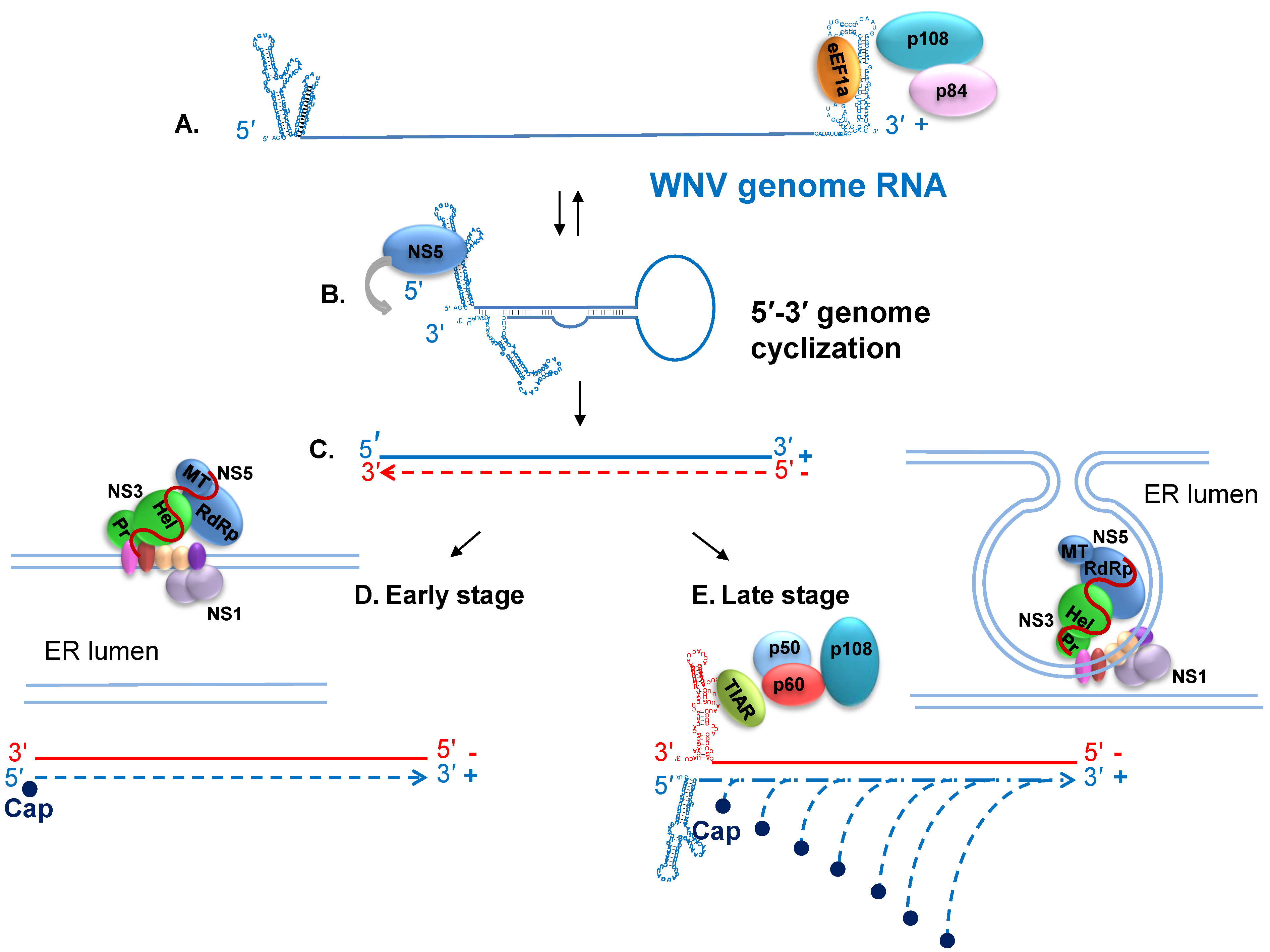 Diagrams of WNV RNA replication at different phases of the viral replication cycle. (A) The linear form of the plus strand RNA genome is utilized as a template for translation; (B) The genome switches back and forth between linear and cyclized forms. The interaction of the cell protein eEF1A with three sites on the 3' stem loop (SL) RNA may facilitate the opening of 3' region basepairs prior to formation of the 3'-5' RNA-RNA interaction that cyclizes the genome. The cyclized form of the genome functions as the template for minus strand RNA synthesis. NS5 recruitment to the 3' end of the minus strand is facilitated by its interaction with the 5' SLA; (C) A single minus stand is copied from the genome; (D) Release of the 3' end of the minus strand from the template-product duplex by an unknown mechanism leads to initiation of the synthesis of a plus strand (genome) RNA. The viral replication complexes are associated with ER membranes at early stages of replication but ER invaginations are not yet observed and reinitiation of plus strand RNA synthesis is inefficient; (E) At later stages of the replication cycle, viral nonstructural proteins have induced the formation of invaginations in the ER membrane that contain viral replication complexes, cell proteins and minus strand templates. Late stage reinitiation of plus strand synthesis is very efficient. The complex formed by TIAR and other cell proteins and the 3' terminal SL of the minus strand is thought to enhance recruitment and possibly also the positioning of NS5 for plus strand reinitiation. Viral nonstructural protein: NS1 (medium blue), NS2A (dark red), NS2B (pink), NS3 (green), NS4A dimer (peach), and NS4B (purple).