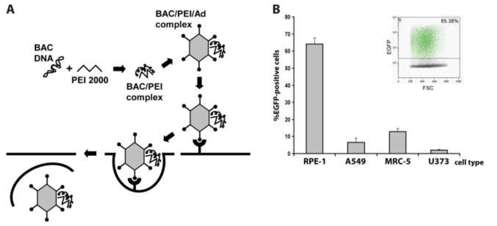 (A) Principle of the adenofection method. BAC DNA is condensed with low molecular weight polyethylenimine (PEI 2000). Addition of replication-incompetent, chemically and physically inactivated adenovirus particles leads to binding of the BAC-PEI complexes to the virions. The DNA-loaded adenovirus particles are taken up by the cells, and the endosomolytic activity of virion protein helps to release the DNA into the cytosol; (B) Adenofection of different human cell types with the EGFP-expressing HCMV BAC pHG-13. RPE-1: retinal pigmented epithelial cell line, A549: lung adenocarcinoma epithelial cell line, MRC-5: primary embryonic lung fibroblasts, U373: human astrocytoma cell line. Transfection efficiency is given as percentage of EGFP-positive cells on day 1 post transfection. Transfections were done in quadruplicates, and standard deviations are indicated. Inlay: example of FACS analysis of adenofected RPE-1 cells.