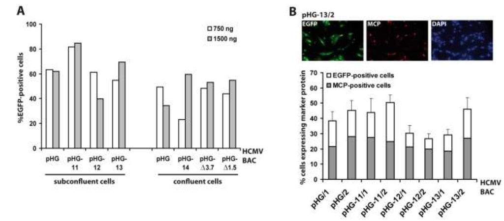 So far, we measured the outcome of adenofection by detection of EGFP, which is under control of the HCMV major immediate-early promoter (MIEP) [33]. EGFP-expression thus directly represents transfection efficiency, because gene expression driven by the HCMV MIEP occurs very early after transfection (and infection) and is independent of the synthesis of other viral proteins. However, most experiments to be performed with HCMV BAC-transfected cells will not only require the initiation of viral gene expression, but also progression to the early and late phases of the HCMV life cycle. Therefore, we analyzed how many of the EGFP-positive cells proceed to the late phase of the infection cycle. A portion of the cells transfected with pHG or pHG-11 to pHG-13 (cf. Figure 2A, left part) was seeded onto cover slips and examined on day four post transfection for the presence of EGFP and the major capsid protein (MCP; a late viral protein) by immunofluorescence (Figure 2B). Compared to the data obtained by FACS analysis, transfection efficiency evaluated by fluorescence microscopy gave slightly lower values, probably because the latter technique is the less sensitive one. We found that in the majority of the EGFP-expressing cells MCP was detected as well, and also displayed the expected nuclear localization, with the percentage of MCP-positive cells (related to the EGFP-expressing cells) ranging from 50% (pHG-11/2) to 75% (pHG-12/2). This result is similar to what is observed after infection with HCMV, where it is known that not all cells expressing immediate-early proteins also make it into the late phase and lead to plaque formation, which can be explained by defective virus particles and/or an unfavorable cellular environment (e.g., failure of viral genomes to overcome intrinsic cellular defense mechanisms such as sequestration at PML bodies). Likewise, it is conceivable that not all of the 240 kb HCMV BAC molecules remain intact during the DNA preparation and transfection procedure. Moreover, progression through the productive infection cycle may be impaired in the absence of tegument proteins that usually counteract the function of cellular restriction factors early in infection [34,35]. This may be overcome by simultaneously transfecting the cells with plasmids encoding the respective tegument proteins, such as pp71 which is known to enhance gene expression from HCMV DNA [36].