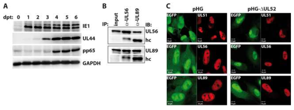 Investigation into RPE-1 cells adenofected with the UL52-deleted genome pHG-Δ52. (A) Transfected cells were harvested on days zero to six post transfection (dpt) and expression of the indicated proteins was analyzed by immunoblotting. Please note that the pp65 antibody exhibits some cross-reactivity with cellular proteins as observed previously [42]; (B) Interaction of the terminase subunits UL56 and UL89 in the absence of UL52. RPE-1 cells adenofected with pHG-Δ52 were subjected to immunoprecipitation with α-UL56 and α-UL89 monoclonal antibodies on day 4 post transfection, followed by immunoblotting using the same antibodies. Input: whole cell lysate before IP, hc: IgG heavy chain; (C) Subcellular localization of HCMV terminase subunits in the presence or absence of UL52. RPE-1 cells were adenofected with pHG or pHG-Δ52 and analyzed on day 4 post transfection by confocal laser scanning microscopy using monoclonal antibodies against UL51, UL56, and UL89.
