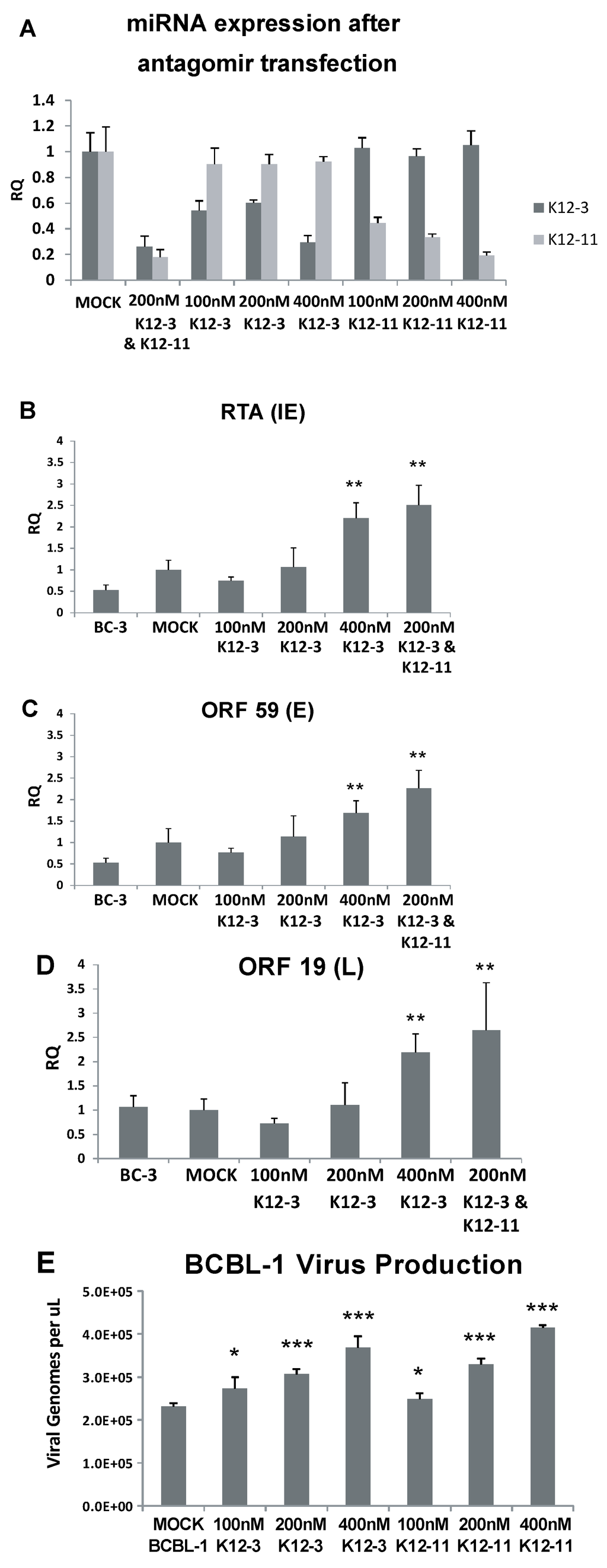 3.2. Lytic Gene Expression and Virus Production Increase upon miR-K12-3 and miR-K12-11 Knockdown in PEL Cells
