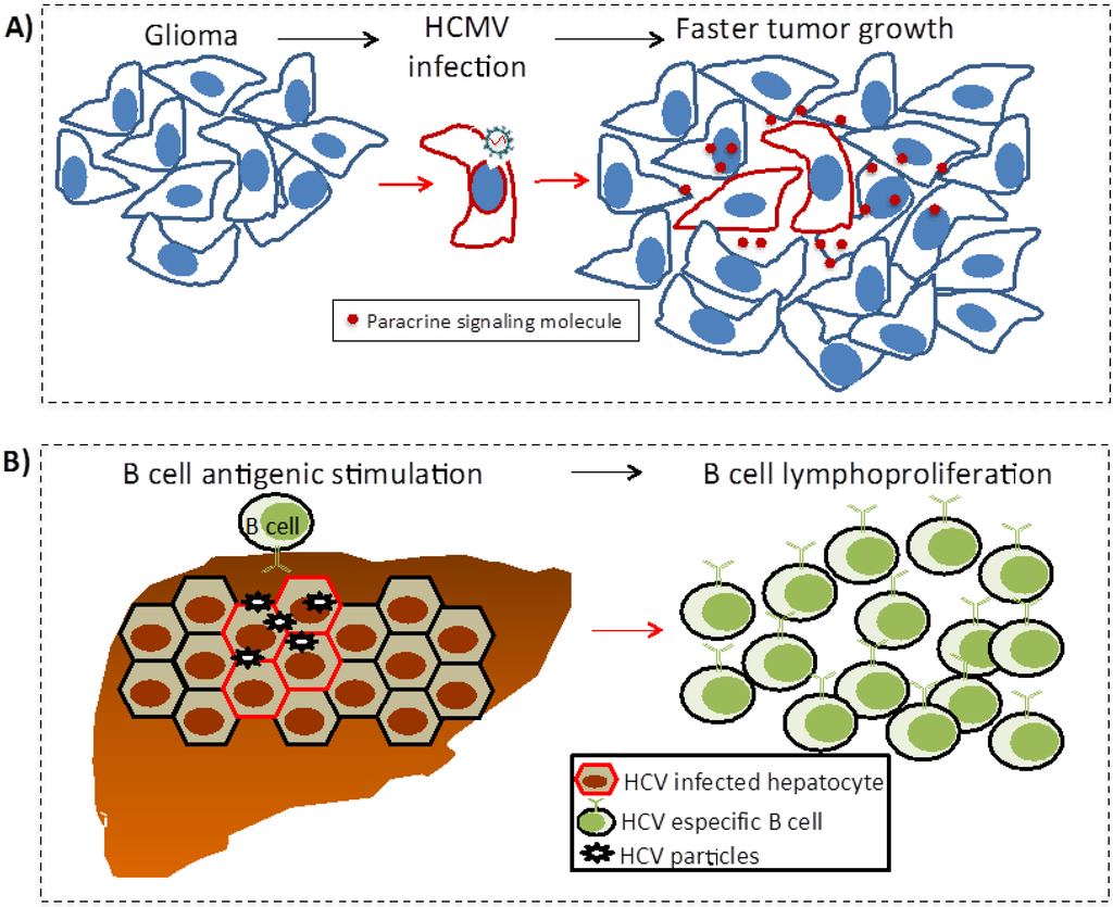 Other indirect mechanisms: Oncomodulation (A) and chronic antigen-driven lymphoproliferation (B). (A) In oncomodulation HCMV does not participate in the initial transformation of the glia; perhaps the virus has an increased tropism for tumor cells once the glioma has formed. Here, the virus only infects a fraction of the tumor cells activating signaling pathways that favor tumor growth; (B) B cells with antigen receptors specific for HCV antigens chronically respond to infected hepatocytes and free virus. This chronic stimulation increases the risk of unregulated lymphoproliferation and lymphoma.