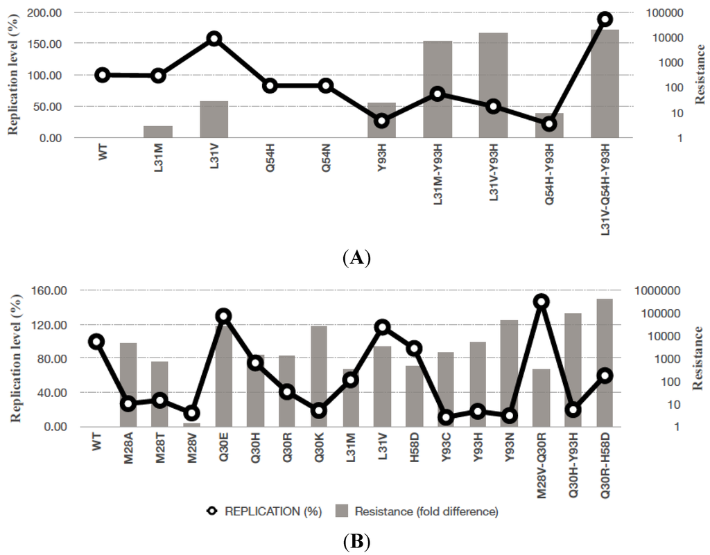 - Gotte, M. The distinct contributions of fitness and genetic barrier to the development of antiviral drug resistance. Curr. Opin. Virol. 2012, 2, 644–650. [Google Scholar] [CrossRef] [PubMed]