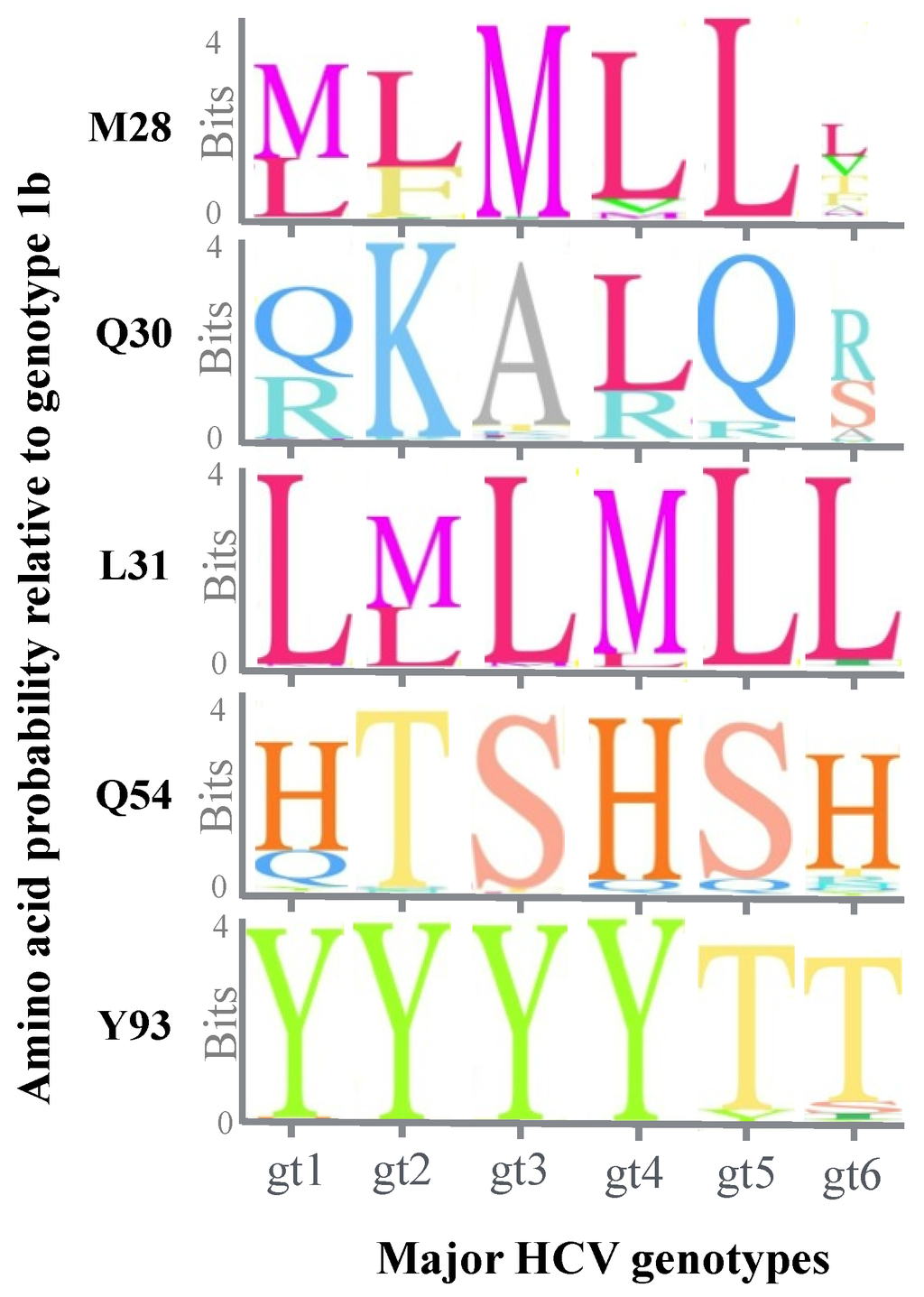 Sequence logo diagram showing sequence heterogeneities at sites associated with DCV resistance. Sequences from each major genotype from the Los Alamos HCV database was aligned using the geneious software []. The height of letters representing relevant amino acids indicates their probability at that position.