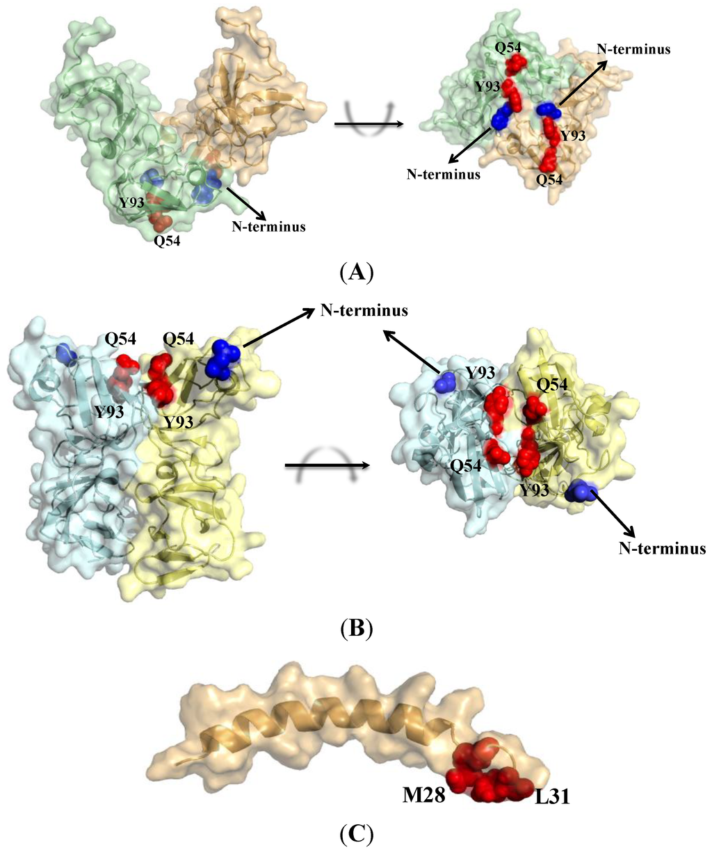 Structures of NS5A domain I. Amino acid positions associated with resistance to DCV are shown as red spheres. The N-terminal amino acid in each monomer is shown in blue. (A) Front view and a 90° in plane rotation of the “open” conformation of NS5A (36–198) (PDB 1ZH1); (B) The side view and an out-of-plane rotation of the “closed” conformation of NS5A (32–191) (PDB 3FQQ); (C) The structure of the N-terminal amphipathic helix of NS5A (1–31) (PDB 1R7G). It is expected to link with each monomeric structure at the N‑terminal amino acid.