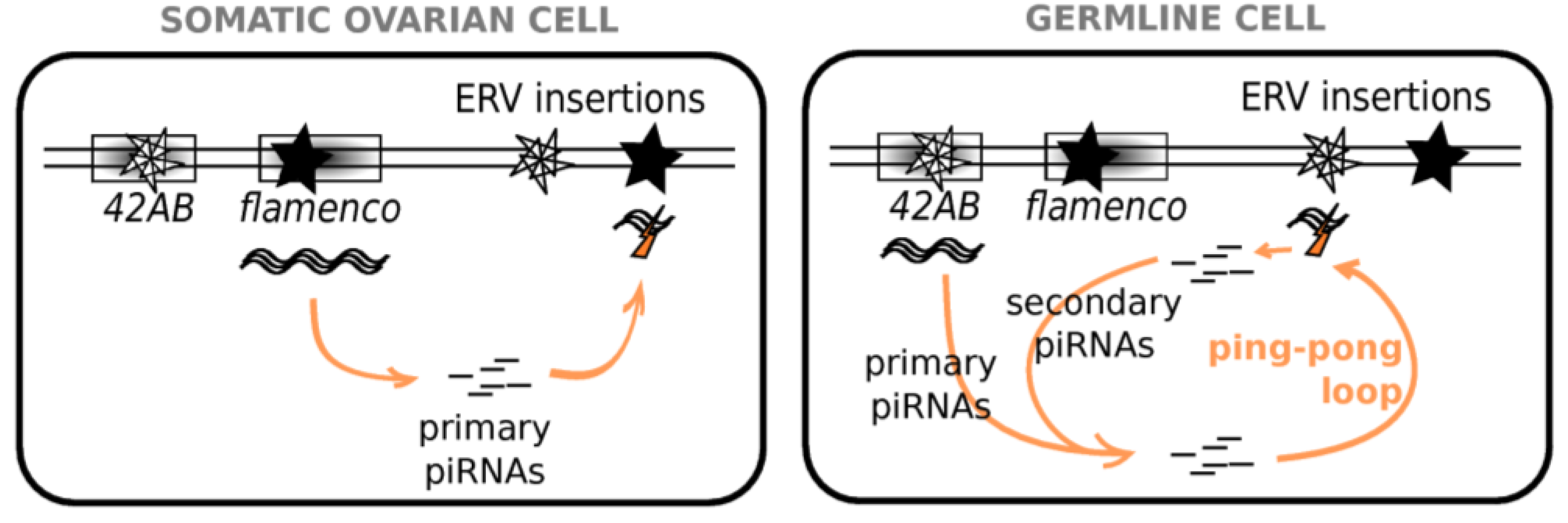 piRNA Pathways in Ovarian Cells. In somatic ovarian cells, clusters, such as flamenco, produce long transcripts, which are processed into primary piRNAs. These piRNAs then trigger the degradation of transcripts of the corresponding TE/ERV families, wherever copies may be integrated in the genome. In germline cells, clusters, such as 42AB produce transcripts, which are processed into primary piRNAs. These piRNAs then trigger the degradation of transcripts of the corresponding TE/ERV families into piRNAs, which trigger the degradation of antisense transcripts also produced by clusters. This generates antisense secondary piRNAs, which are able to target TE/ERV transcripts. Such a phenomenon, called “ping-pong loop”, allows amplification of the silencing.