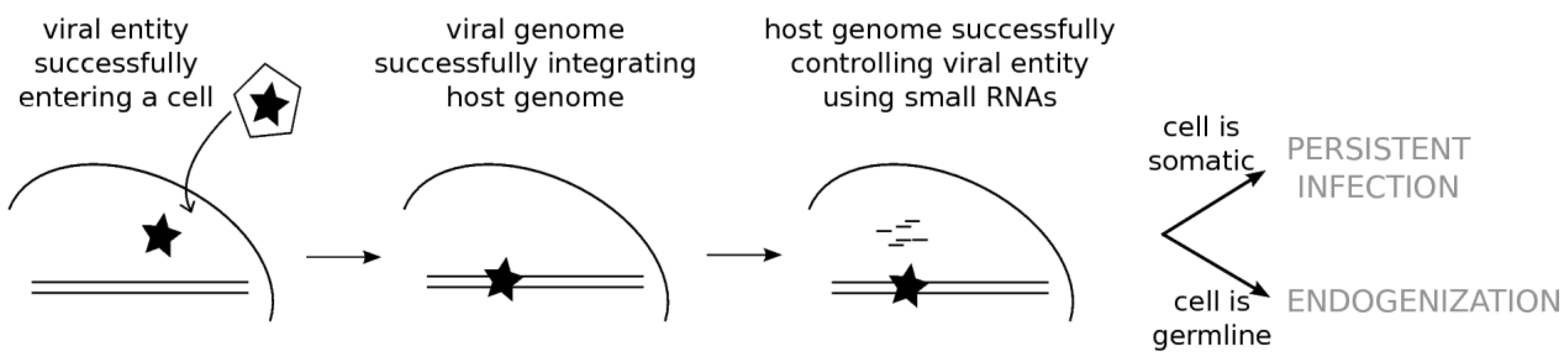 ERVs and exogenous viruses both can be the targets of piRNAs as well as siRNAs, and this raises the question of whether and how the cell distinguishes between endogenous and exogenous viral entities. In Drosophila S2 cells, Goic et al. [70] worked on persistent infections of the Flock House virus. Contrary to acute infections, persistent infections correspond to the absence of cellular lysis and the viral genome remaining within the cell without being cleared by the immune system of the host. Goic et al. showed that persistent infections of the Flock House virus are due to viral integrations into LTR retrotransposon sequences thanks to the retrotransposon machinery. Chimerical siRNAs can subsequently be produced. In this way, persistent infections are allowed by viral integration into the host genome. This draws a parallel between ERVs and arboviruses, which frequently display persistent infections in Arthropods. Comparable processes may be at play in both persistent infection and endogenization, the difference coming from the nature of the infected cell, somatic or germline, respectively (Figure 3). This results in the ERVs establishing a long lasting cohabitation with insect genomes, whereas persistent infections of arboviruses most often imply new infections at each generation.