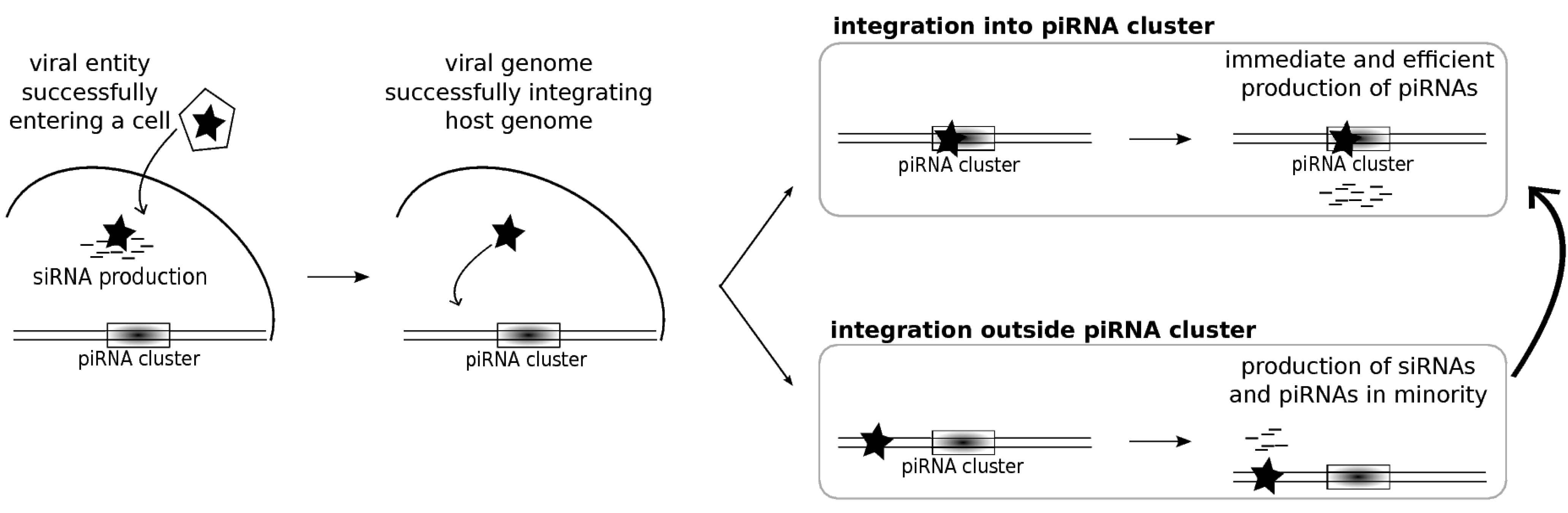 Schematic View of Small RNA Control Setup. Consider an RNA-based viral entity that managed to escape antiviral response, such as Toll, Imd or Jak-STAT pathways. When its genetic material is released into the cell, siRNAs are produced and trigger its degradation. Despite this siRNA defense, we can imagine that some viral genetic material may become integrated into the cellular genome (either by its own machinery or with the help of endogenous enzymes encoded by ERVs or other TEs). Integration into an already existing piRNA cluster, such as flamenco, provides immediate cellular protection through piRNA production. Immune memory against the corresponding viral family is acquired. In case the integration happens elsewhere in the genome, siRNAs are produced from that loci, as well as piRNAs, although in the minority. Control by siRNAs is not absolute, which allows subsequent insertions into a major piRNA cluster, which then provides complete control.