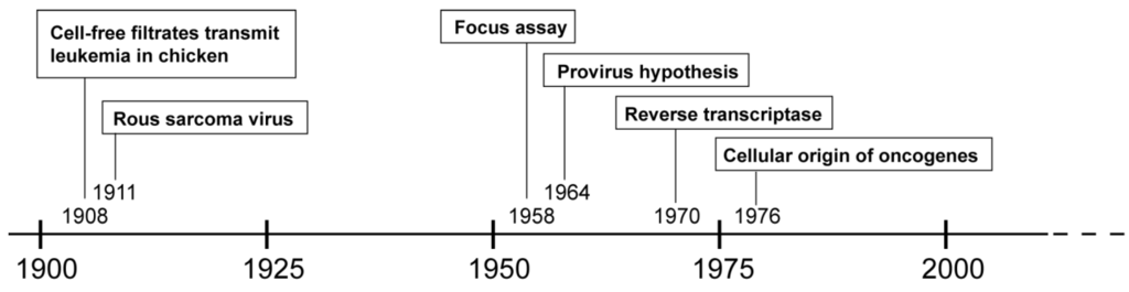 Timeline of hallmark events in the history of retrovirology.