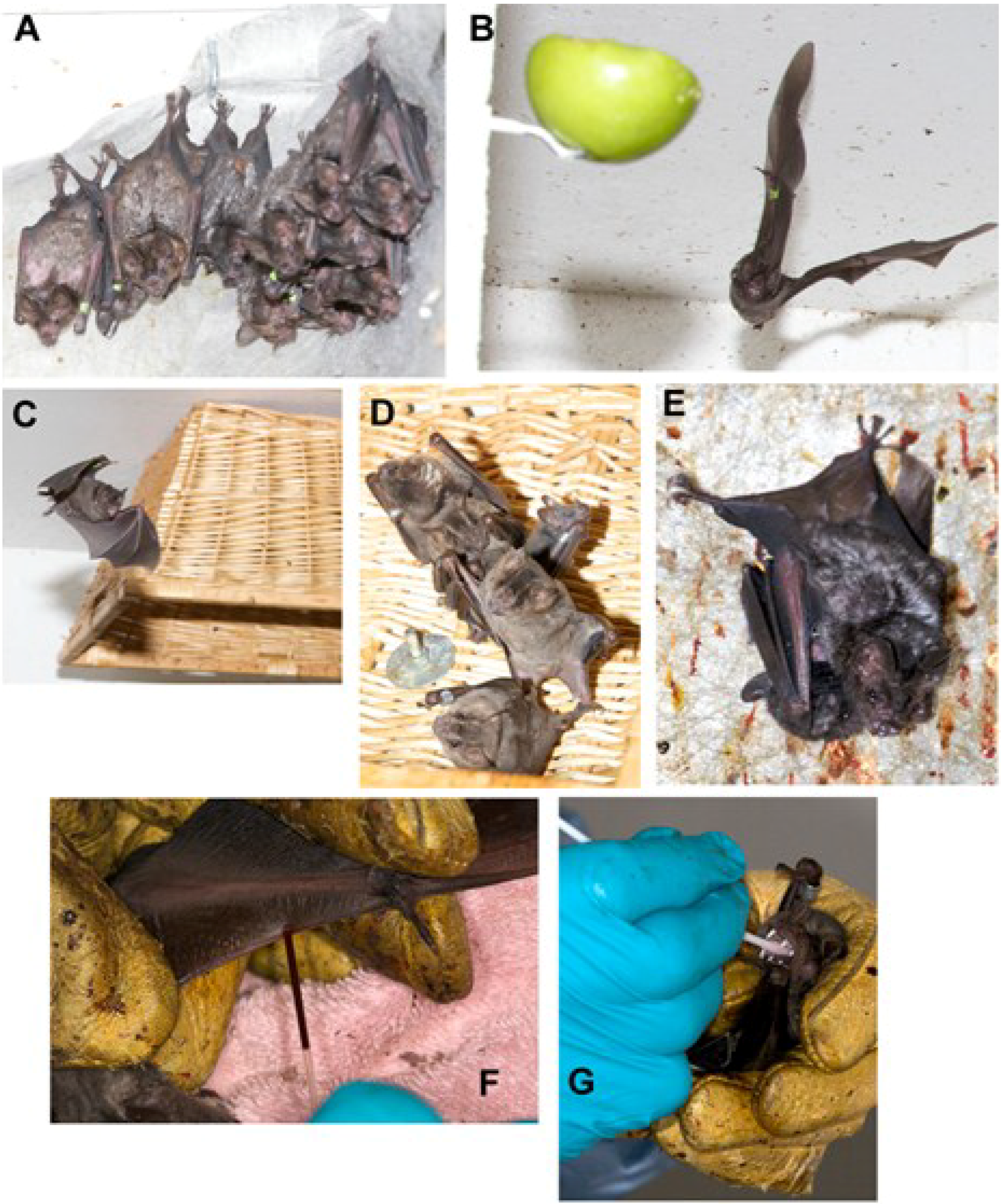 Bat husbandry and manipulations. Establishment of bat colonies for experimental research requires enrichment for successful maintenance and reproduction. (A) Landscape fabric attached to walls provides roosting substrate; (B) Hanging of fruit on skewers can provide enrichment for frugivorous bats by stimulating foraging behavior. A wing band (green) is present with a unique identification number; (C, D) Hanging of inverted wicker or metal baskets provide additional roosting substrates; (E) A female Seba’s fruit-eating bat (Carollia perspicillata) with offspring; (F) Blood collection from a bat wing; (G) Oral swab for virus collection. Photos are by the author and are of the colony at the University of Northern Colorado [3,66,106].