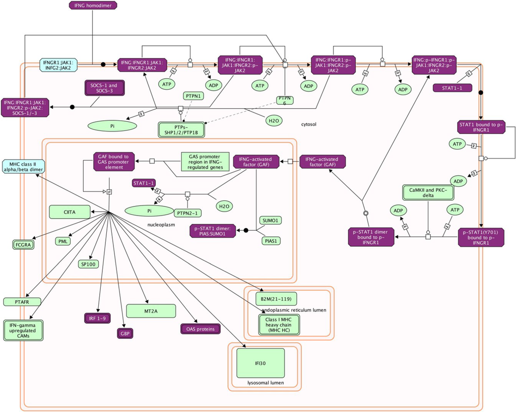 Reactome mapping of differentially-expressed genes. Abundance of differentially-expressed IFNγ pathway transcripts in Pirital arenavirus-infected hamster livers relative to uninfected group were estimated by RSEM and statistically analyzed with DESeq. The symbols for the elevated genes were imported into the Reactome plugin of Cytoscape for pathway analysis. Genes in purple boxes were elevated in infected animals (author’s unpublished data) and suggests this pathway is important in the host response to the virus.