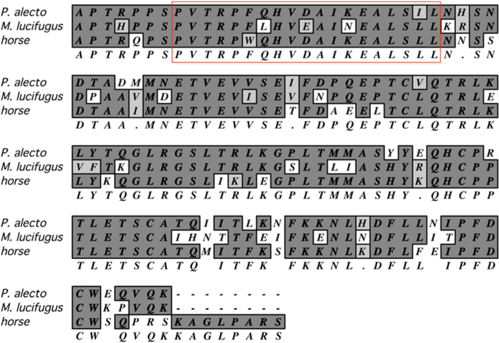 Amino acid alignment of mature GM-CSF from horse, P. alecto and M. lucifugus. Identical amino acids in dark gray, similar amino acids in light gray, and dissimilar amino acids in white, consensus below. The red box is the putative helix A involved in binding to the GM-CSF receptor. Alignment performed with MacVector using the default CLUSTAW settings [128].