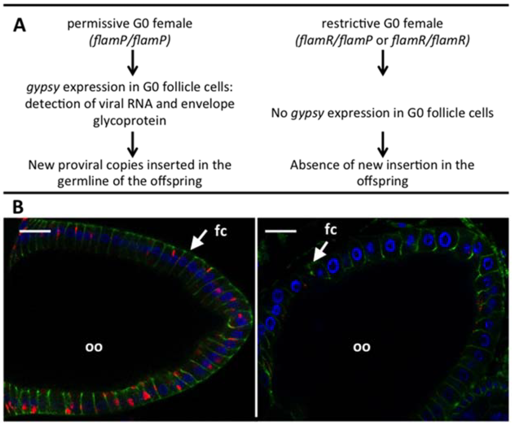 (A) Maternal control of gypsy replication by flamenco; (B) Immunostaining against gypsy envelope in permissive (left) and restrictive (right) egg chambers (scale bar 20 µm). Blue: Dapi; red: gypsy Env; green: Dlg, a cellular protein present at the junctions between follicle cells. fc: follicle cell; oo: oocyte.
