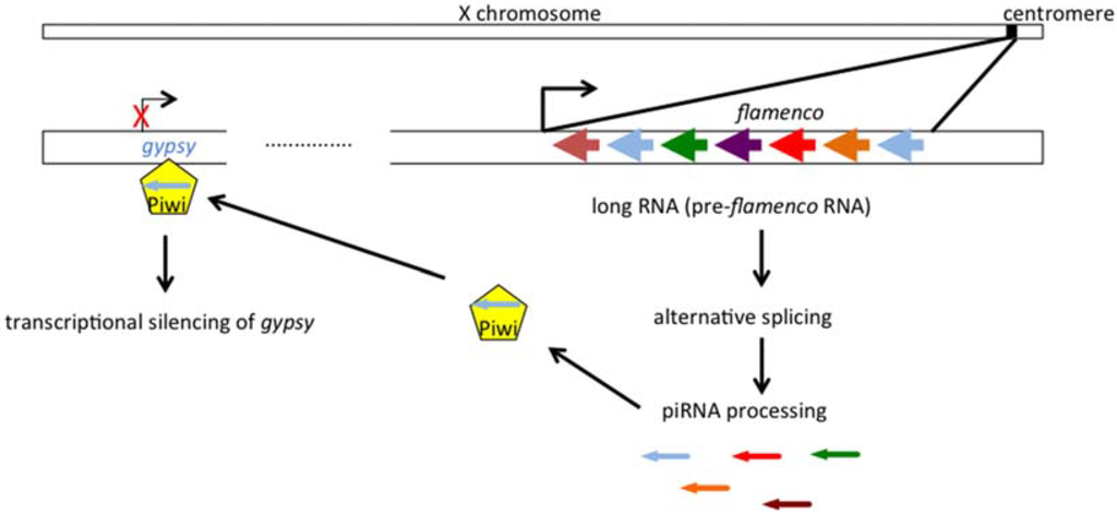 Transcriptional silencing of gypsy by flamenco. The antisense piRNAs are processed from the pre-flamenco RNA (arrows, colors identify truncated errantivirus, blue=gypsy), then loaded onto Piwi. This piRNA-inducing silencing complex establish a repressive chromatin state on gypsy, inducing transcriptional silencing.