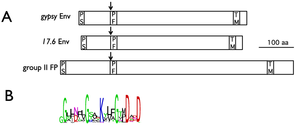(A) comparison of gypsy Env , 17.6 Env and baculovirus group II Fusion Protein (FP) structural properties. Arrows indicate the furin cleavage site. PS, peptide signal; PF, peptide fusion; TM, transmembrane. (B) Logo representation (weblogo.berkeley.edu/logo.cgi) of the peptide fusion consensus sequence between 23 errantiviruses Env and 9 group II FP amino acid sequences.