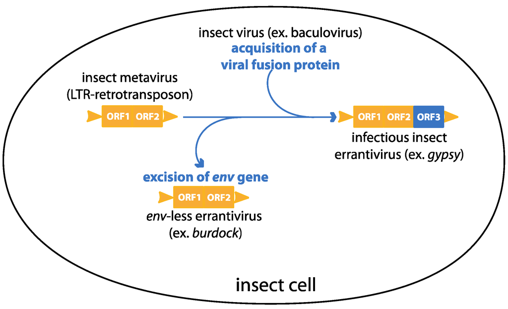 The gypsy element in Drosophila provides a good experimental system for the various steps in endogenization. In order to invade the genome of a new species, the potential endogenous element must first establish itself in at least one individual of that species. Gypsy is an errantivirus, a subtype of the Metaviridae division of LTR transposons, which possess a third ORF coding for an env-like gene. This might permit classical retrovirus-like infectivity.