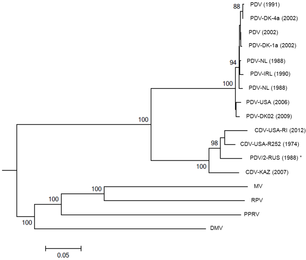 A phylogenetic tree was constructed de novo from published and unpublished H gene sequences of PDV (Europe 1988, 2002, USA 2006), CDV (R252 canine strain, a wild-type raccoon strain, Baikal seal CDV and Caspian seal CDV), RPV, MV and DMV (representing the cetacean morbilliviruses) to demonstrate the evolutionary relationships of PDV isolates within the wider genus (Figure 1). Neighbor-joining methodology was used and the H glycoprotein was chosen as this is under immunological pressure. Furthermore, it is known that there is good correlation between trees generated using H gene sequences and those using the highly variable cytoplasmic tail of the N protein, which is commonly used for morbillivirus genotyping []. The phylogenetic tree demonstrates that PDV and CDV cluster into distinct, but evolutionary similar, lineages and each lineage has several variants circulating as wild-type virus with slight variations between PDV isolates from the northeastern and northwestern Atlantic.