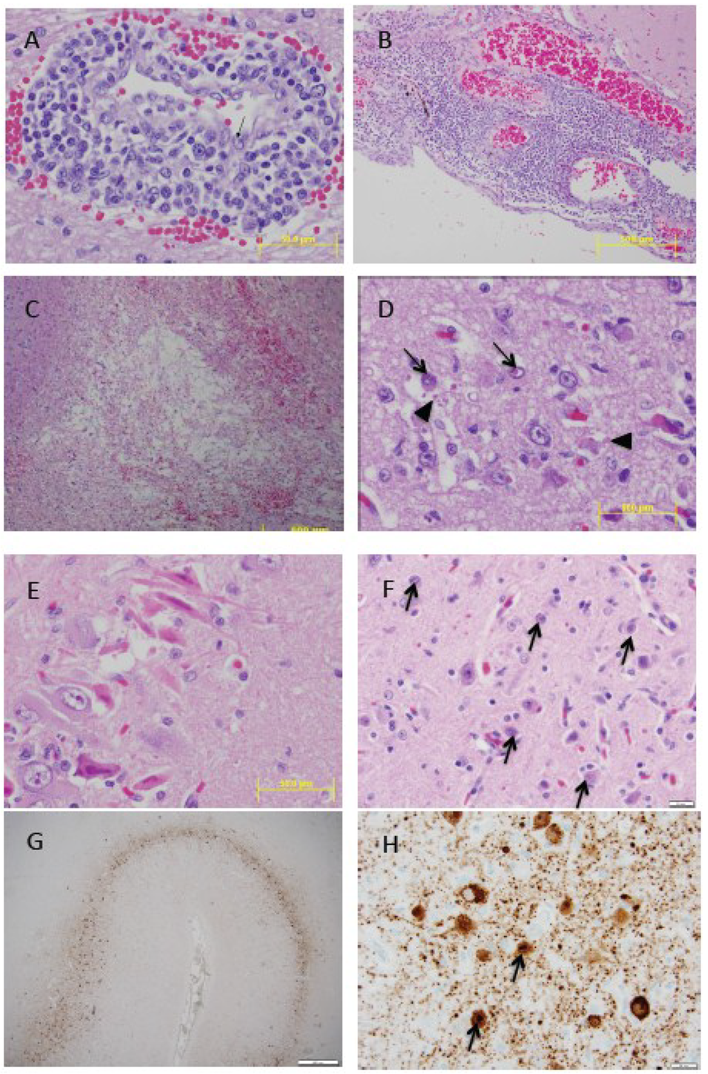 (A) Grey seal (Halichoerus grypus) cerebrum showing expanded Virchow Robin space containing lymphocytes. Activated endothelial cell (arrow). H&E stain (B) Grey seal cerebrum with marked non-suppurative meningoencephalitis. H&E stain (C) Grey seal cerebral white matter with focal malacia centrally and peripheral focal hemorrhage. H&E stain (D) Grey seal cerebrum with acidophilic intranuclear inclusion bodies (INIB, arrow) and intracytoplasmic inclusion bodies (ICIB, arrow heads). H&E stain (E) Grey seal hippocampus with acute focal neuronal necrosis. H&E stain (F) Harp seal (Pagophilus groenlandicus) cerebrum with numerous INIBs (arrows). H&E stain; (G) Harp seal cerebrum showing laminar distribution of morbillivirus antigen. Immunohistochemistry (IHC) using primary antibody against the nucleocapsid (N) of canine distemper virus (VMRD, Inc., Pullman, WA, USA); (H) Harp seal cerebrum. Neurons with strong staining of morbillivirus antigen in cytoplasm and nuclei (arrows). IHC stain as described. The grey seal tissues are from a pup that stranded in February 2006 in Maine, USA, with neurological clinical signs []. The harp seal tissue is from a juvenile that stranded on Prince Edward Island, Canada, in May 1991 with similar clinical signs [].