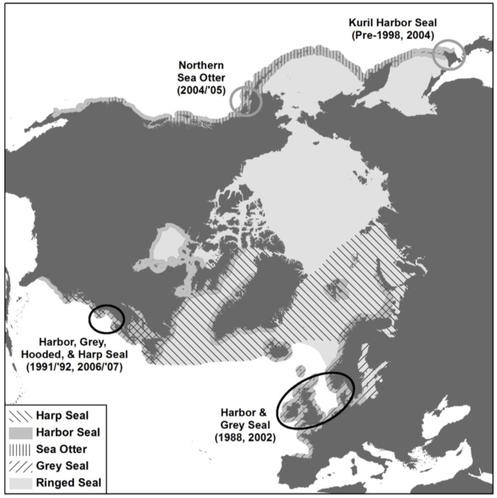 Beginning in late 1987 seemingly unprecedented epidemics spread through pinniped populations from Siberia to Western Europe. The series began with the mass mortality of Baikal seals (Pusa sibirica) in land-locked Lake Baikal []. The event followed an outbreak of canine distemper virus (CDV) infection in terrestrial mammals and a variety of diagnostic tests later confirmed that CDV was implicated in the seal deaths [,]. Shortly afterwards, beginning in April 1988, an epidemic swept through breeding colonies of European harbor seals (Phoca vitulina vitulina) around the coasts of the North, Baltic and Irish seas killing up to 18,000 of this species and possibly a few hundred sympatric grey seals, Halichoerus grypus []. However, while the clinical presentation and pathology were similar to CDV infection, antigenic characterization and gene sequencing demonstrated that the virus was a novel and distinct member of the Morbillivirus genus, phocine distemper virus, PDV [,,].