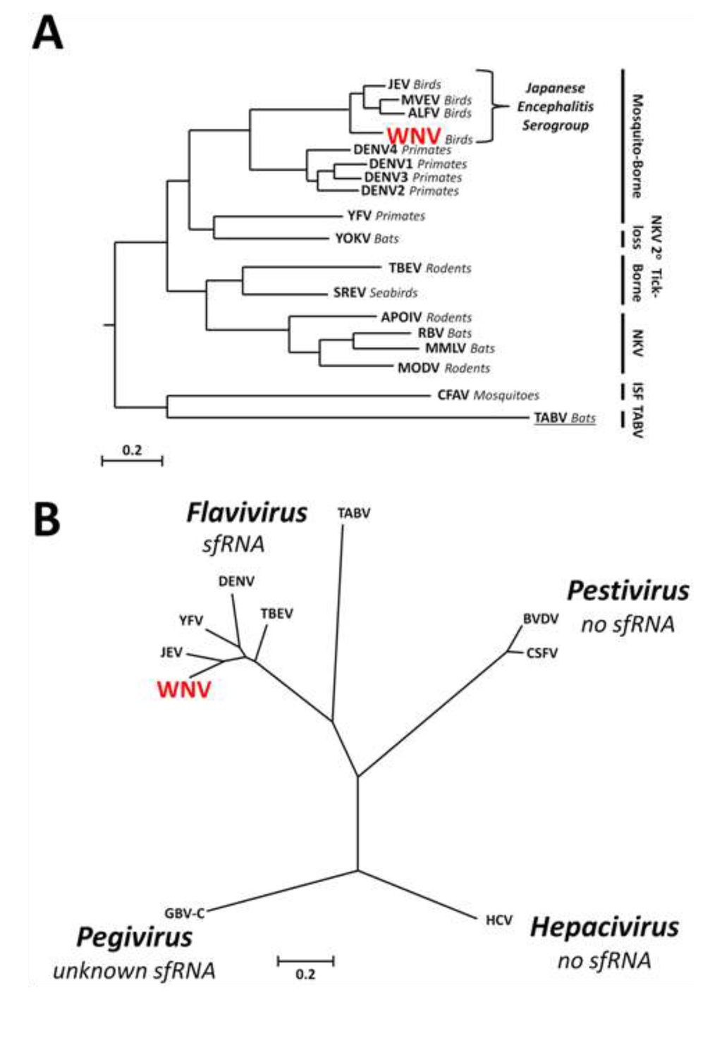 West Nile virus (WNV) is an emerging pathogen of humans that has the capacity to induce fatal encephalitis in the infected host [1,2,3]. WNV is a member of the genus Flavivirus within the family Flaviviridae which comprises small, enveloped viruses with non-segmented genomes consisting of single-stranded positive sense RNA. The Flavivirus genus can be divided into four main groups: mosquito-borne, tick-borne, no known vector (NKV), and the highly divergent insect-specific (ISF) groups (Figure 1A,B) [4,5,6,7,8]. Viruses belonging to the mosquito- and tick-borne groups are maintained in a natural transmission cycle between amplifying vertebrate hosts and particular haematophagous arthropods. NKV viruses are restricted to mammalian bat or rodent hosts, without a known arthropod vector for transmission. ISFs are the most divergent group, infecting and transmitted by predominantly Aedes and Culex genus mosquitos, and are unable to infect vertebrate hosts. Tamana bat virus (TABV) is the most divergent species apparently replicating exclusively in mammalian cells [9], requiring placement in its own group removed from the rest of the genus [10,11].