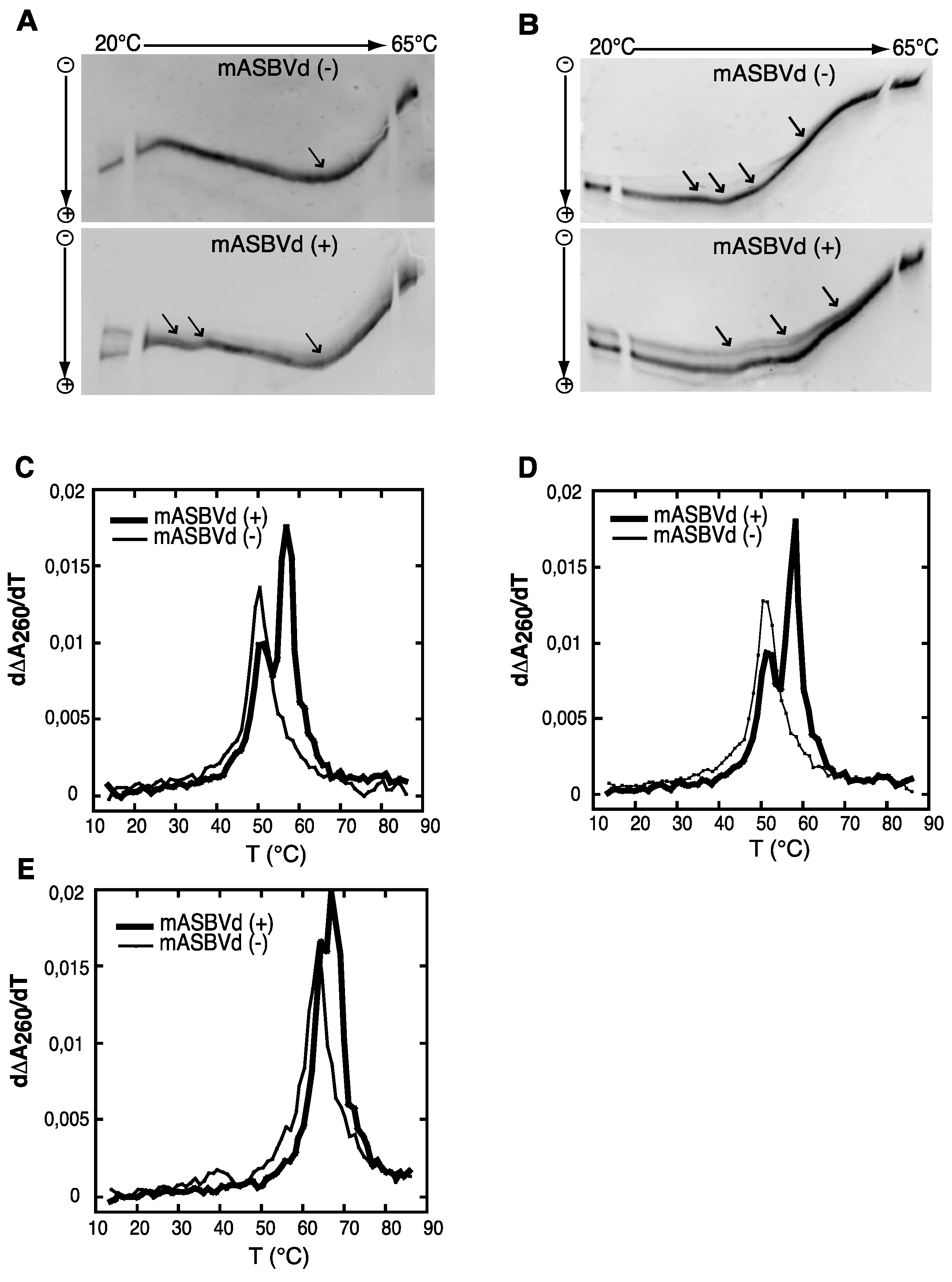 Temperature gradient gel electrophoresis (TGGE) and melting curves of mASBVd (+) and mASBVd (−) transcripts. (A) TGGE analysis performed by native 8% PAGE in 0.2× TBE buffer. (B) TGGE analysis performed by native 8% PAGE in 0.2× TB buffer containing 20 μM magnesium acetate. Migration was monitored between 20 °C and 65 °C. The arrows denote the transition temperatures. Derivative absorbance melting profiles were determined either in 150 mM KCl and 10 mM sodium cacodylate (pH 7.2) (C) or with, in addition, 100 μM MgCl2 (D) or 1 M NaCl (E). The first derivative profiles (d∆A260/dT) are shown with a thick curve for mASBVd (+) and a thin curve for mASBVd (−).