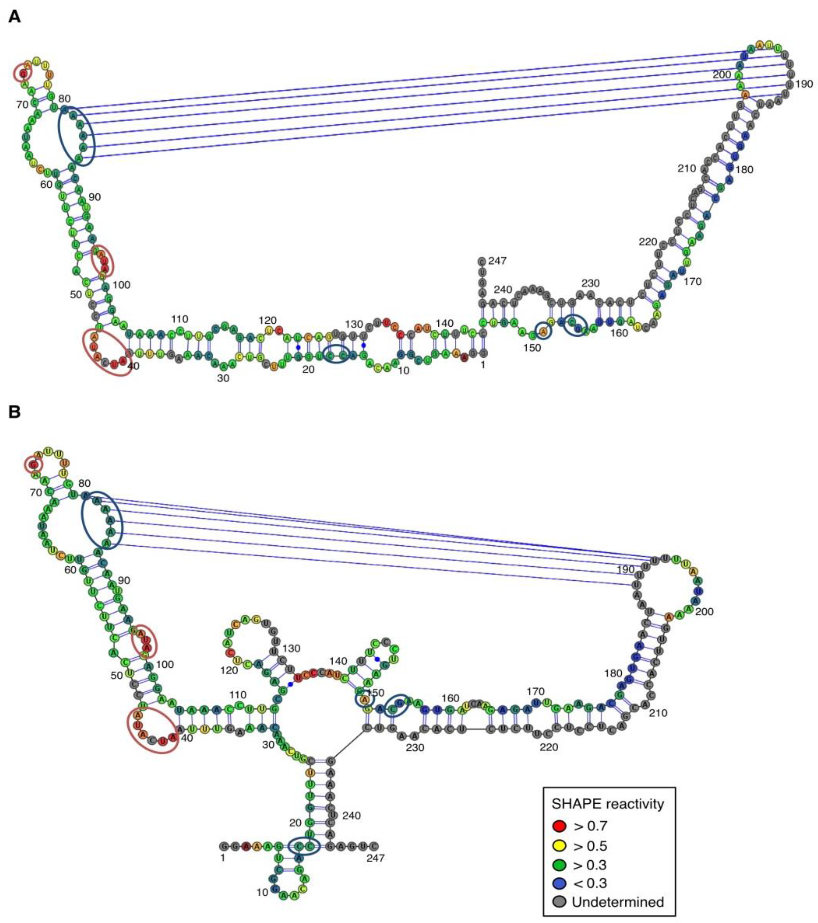 Secondary structure models of ASBVd (−) based on the SHAPE analysis. (A) and (B) are the two secondary structure models proposed for ASBVd (−). The color of the circle surrounding each nucleotide reveals their relative reactivity to 1M7 in the presence of 10 mM Mg2+, as mentioned in the box. High reactivity reflects single-stranded region, while paired nucleotides are not reactive. Nucleotides for which the reactivity could not be determined are shown in grey and correspond to the primer binding site, or to nucleotide right 3' to the primer for which the electrophoresis resolution is not good enough, or to RT stops. The same experiments were carried out without Mg2+ and differences in reactivity are represented on the scheme: nucleotides circled in red show enhanced reactivity in the presence of Mg2+, and those in blue are less reactive. Blue lines represent the potential kissing-loop interaction. The models were designed using VaRNA [31].