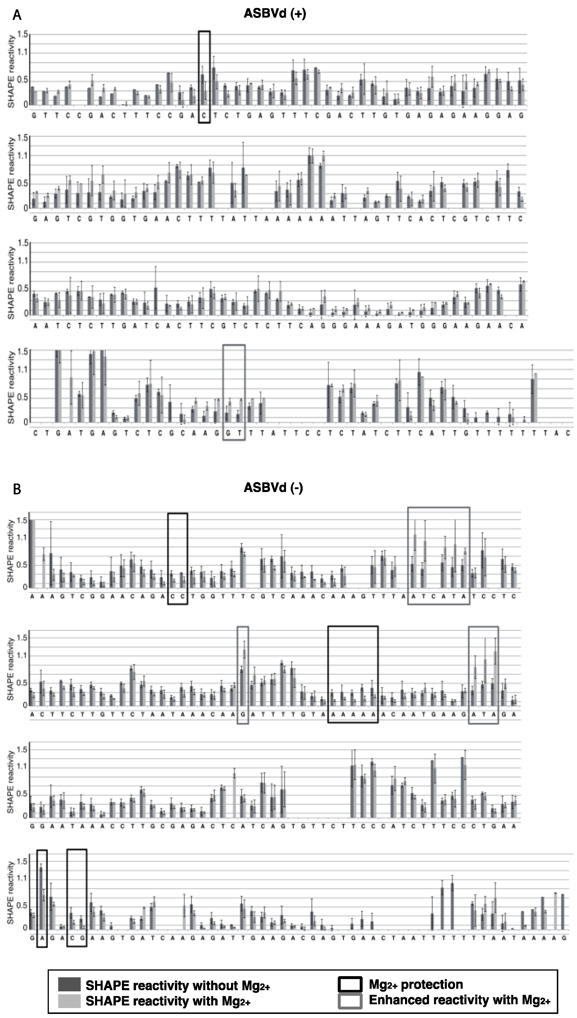 Comparison of the 1M7 reactivity profiles of ASBVd (+) (A) and ASBVd (−) (B) RNAs in the absence and in the presence of Mg2+. The reactivity of each nucleotide is represented in dark grey for the experiment without Mg2+ and in light grey in presence of 10 mM Mg2+. Error bars represent the standard deviation in 3 experiments. Regions boxed in black or grey highlight the nucleotides significantly (student test p < 0.05) under-reactive or over-reactive in the presence of Mg2+, respectively. The first nucleotide of each lane is numbered, 1 denotes the transcription start. Nucleotides with a negative value correspond to non-specific reverse transcriptase stops. Please note that the nucleotides at the 3' terminus which reactivity could not be determined because they are too close to the primer are not represented in these profiles although the molecules probed correspond to the full length ASBVd (+) and ASBVd (−) (64 and 44 nucleotides respectively).