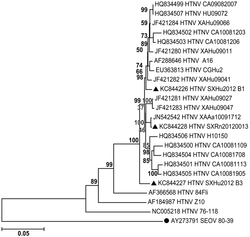 Phylogenetic tree of S segments from related hantaviruses. Mega 5 was used to construct the phylogenetic trees by using the neighbor-joining (NJ) and the maximum likelihood (ML) methods with 1,000 bootstrap replicates. S segment of Seoulvirus (SEOV) was used as an out-group. (●AY273791 SEOV 80–39). ▲The sequences reported in this study.