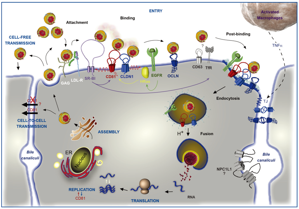 In conclusion, the tetraspanin CD81 is a central regulator of HCV lifecycle. By an interplay with the other HCV entry factors, and likely because of its membrane diffusion properties, it acts as an organizer of the HCV entry factor complex thus controlling the initiation of infection. Although, precise mechanisms still need to be defined, CD81 might also play an important role in HCV RNA replication, dissemination and host response. This makes it a potential therapeutic target, as evidenced by the in vivo use of anti-CD81 antibodies [65]. However, CD81 is involved in a large number of cellular responses, thus the use of such a therapeutic strategy in humans could lead to side effects. Nevertheless, since CD81 associates with CLDN1 to form complexes essential to viral entry, a promising therapeutic strategy would be to develop tools that specifically target these complexes or by targeting the molecules involved in their regulation (as reviewed in Zona et al. [243]). Such a strategy would be particularly appropriate to avoid systematic reinfection in liver transplant patients.