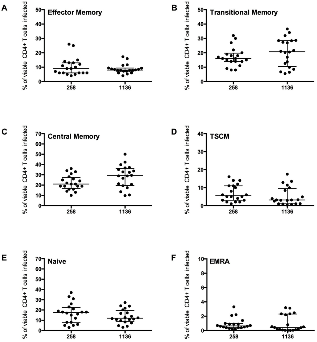 CD4+ T cell subset infection by HIV-1 subtype C Env pseudotyped GFP reporter viruses. CD4+ T cells from 5 healthy donors were infected with virus pseudotyped with 4 Envs from subject 258 and four from subject 1136, as described in the Experimental section. The percentage of infection for each CD4+ T cell subset was determined and quantified by flow cytometry (as shown in Figure 4). These CCR5-using viruses preferentially infected (B) TM and (C) CM T cells (mean level >17% infection), with a modest level of infection was seen in (A) EM (mean >8%), (D) TSCM (mean >5%) and (E) Naïve T cells (mean >13%). (F) EMRA were rarely infected (mean 1%). Scatter plots represent the median and interquartile range.