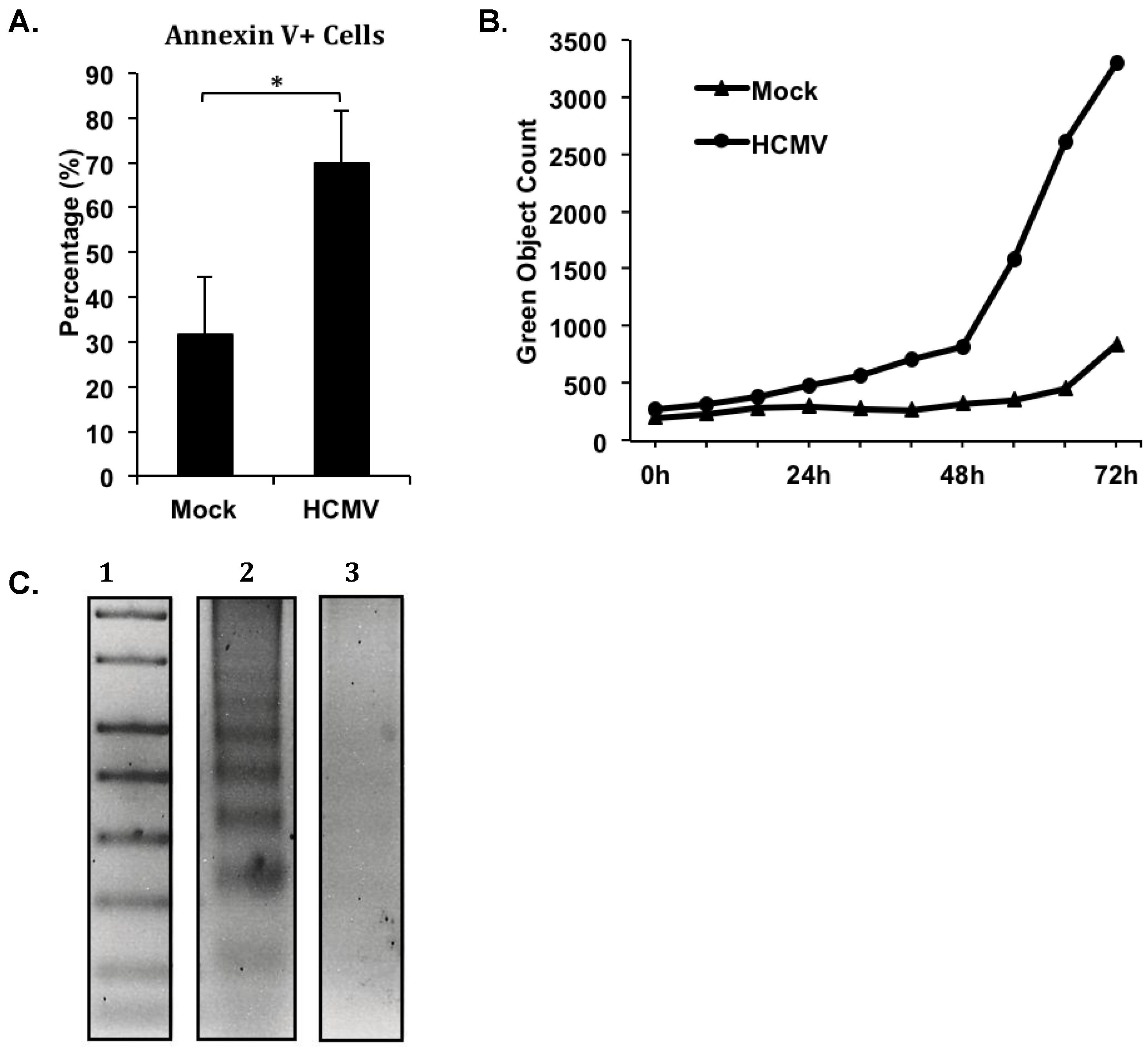 Human cytomegalovirus (HCMV) induces the upregulation of apoptosis-associated markers in the absence of increased apoptosis. Primary human peripheral blood monocytes were isolated as previously described [22,44]. Monocytes were mock- or HCMV-infected (Towne/E p.41 MOI 5) for 72 hours at 37 °C in 5% CO2, and kept either in suspension (A and C) or adherent in a 96 well plate (B) in 1% human serum RPMI 1640 (Cellgro). (A) At 72 hours post infection, monocytes were harvested, stained with Annexin V-FITC and PI, and analyzed by flow cytometry. The average percentage of Annexin V positive, PI negative cells in each sample from three separate donors is represented. Student’s paired t-test was used to determine statistical significance (* p < 0.05). (B) At the time of infection, triplicate samples were treated with 5 μM CellPlayer™ 96-Well Caspase-3/-7 reagent. Samples were placed in an IncuCyte™ Zoom live imaging system at 37 °C and 5% CO2. Phase contrast and green fluorescence images of each sample at identical areas were acquired every six hours for 72 hours. The number of green objects detected per image was normalized to the number of cells detected by phase contrast per respective image. The resulting green object count for each sample is represented. (C) At 120 hours post infection, fragmented DNA was harvested from samples using a Calbiochem® Suicide Track™ DNA Ladder Isolation kit. Isolated DNA was run on a 1.5% agarose/TAE gel at 50 constant volts. The gel was then stained with ethidium bromide and apoptotic DNA was visualized by UV illumination. All samples were run on the same gel under the same conditions; however, a lane containing an irrelevant treatment option was removed for the final figure. Lane 1 contains the 1 kb DNA standard ladder, Lane 2 contains DNA from mock-infected monocytes, and Lane 3 contains DNA from HCMV-infected monocytes.