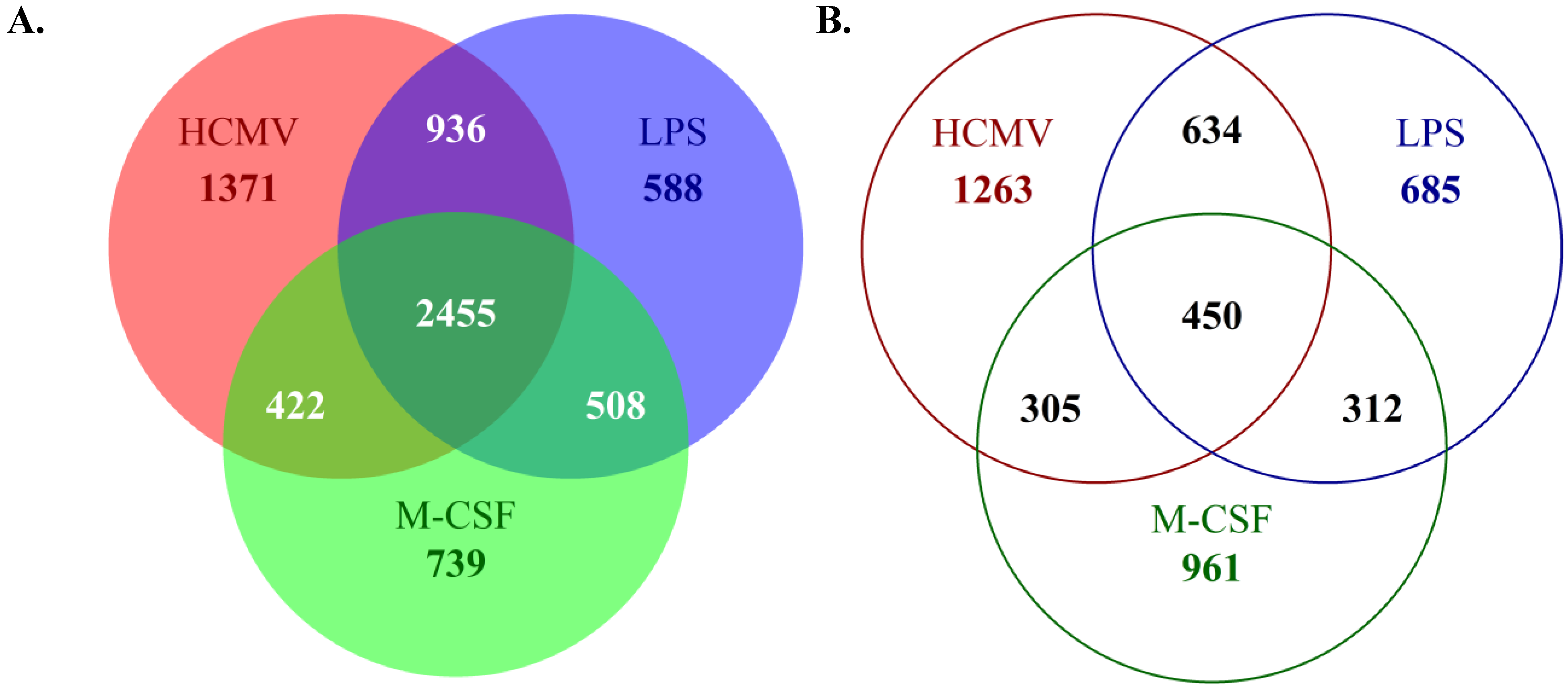 HCMV infection of monocytes induces a unique subset of gene expression changes when compared to monocytes polarized towards an M1 or M2 phenotype. Monocytes were mock- or HCMV-infected (Towne/E p.41 MOI 5), or treated with LPS (100 ng/mL) or M-CSF (100 ng/mL) for two weeks at 37 °C and 5% CO2 under adherent conditions. At two weeks, RNA was harvested from each sample. Harvested RNA was used to perform microarray analysis on Affymetrix U133 Plus 2.0 genechips. Probe sets to represent individual genes were selected by using JetSet [89]. The genes that were upregulated (A) or downregulated (B) (≥2 fold change when compared to mock-infected monocytes) were compared between treatments and the number of unique or shared genes among samples is represented.