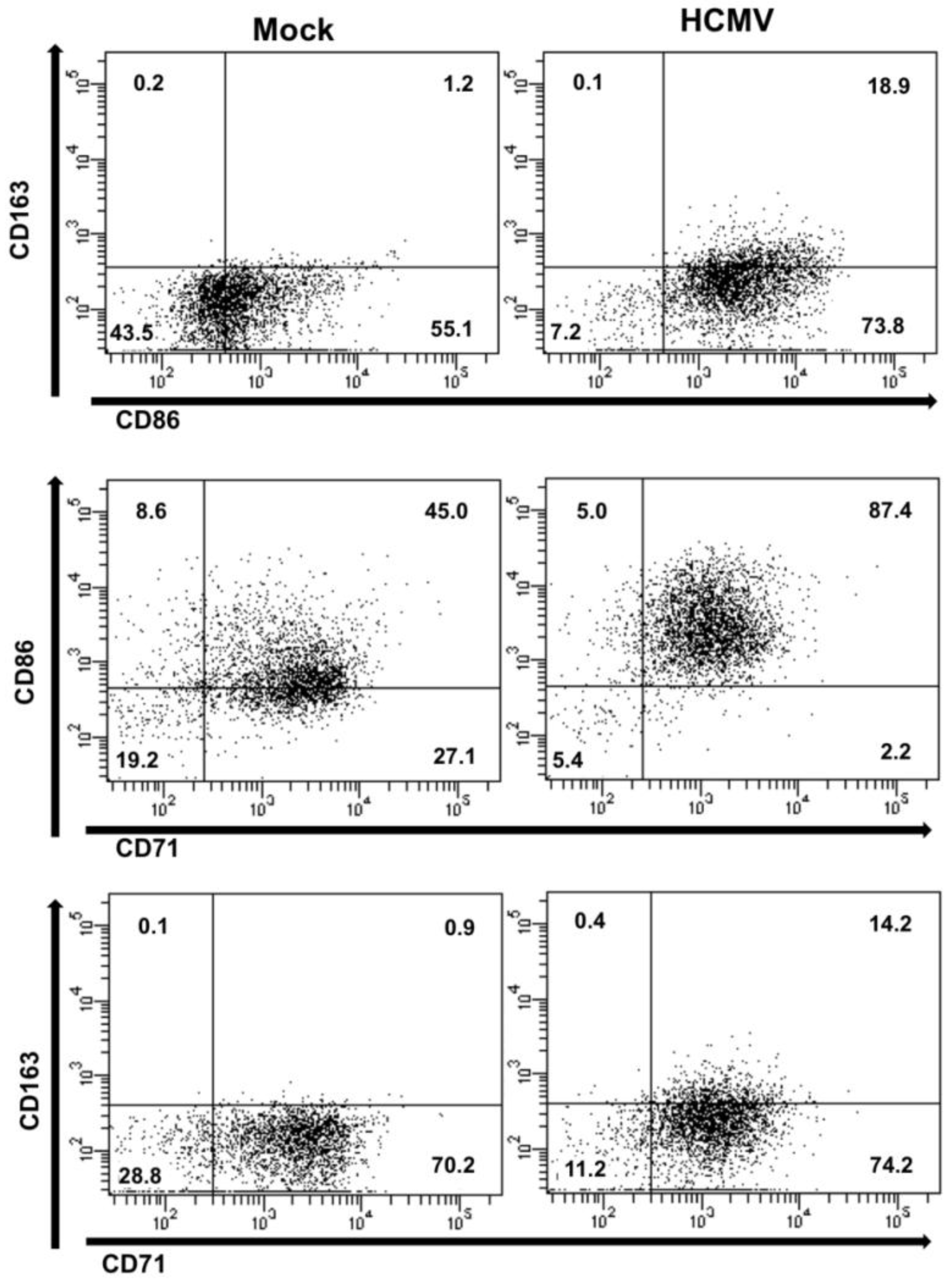 HCMV infection of monocytes induces a macrophage polarization phenotype that is distinct from M1 or M2 polarization. Monocytes were mock- or HCMV-infected (Towne/E p.41 MOI 5) at 37 °C and 5% CO2 for five days. Monocytes/macrophages were washed with PBS, blocked in 5% fetal bovine serum and stained with Alexa fluor-conjugated antibodies specific for CD14 (a myeloid specific marker), CD71 (a macrophage specific marker), CD86 (an M1 macrophage associated marker), or CD163 (an M2 macrophage associated marker). Cells were then analyzed by flow cytometry and gated by forward and side scatter and for CD14 positive cells. Scatter quadrant plots were generated indicating the number of cells expressing the various staining profiles.