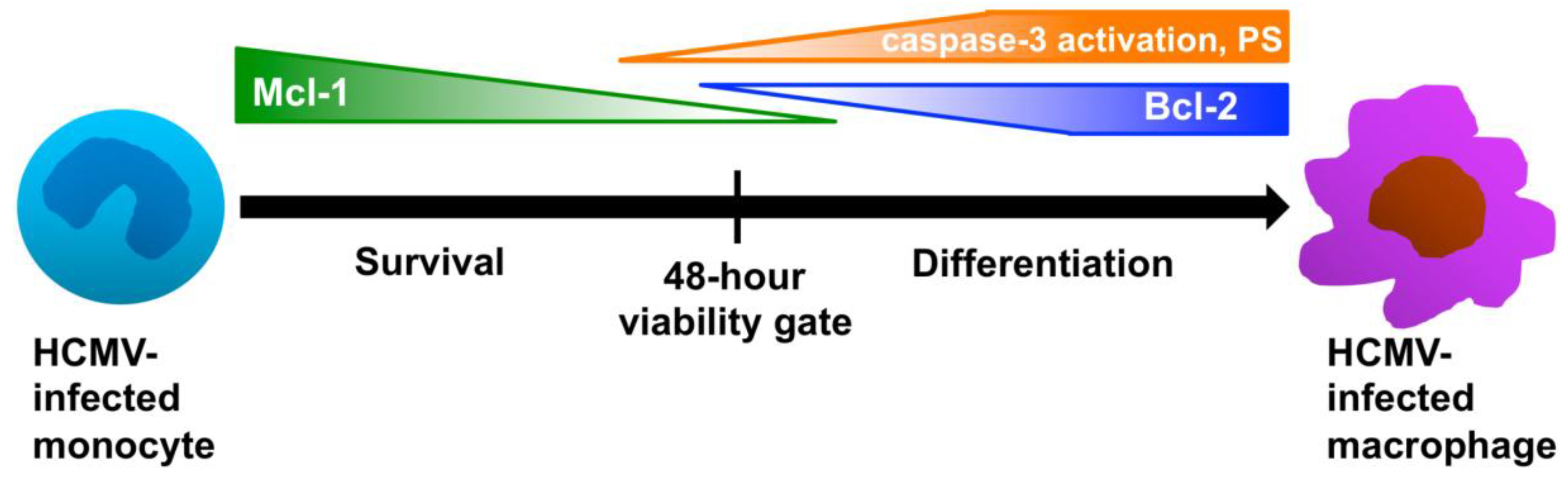 HCMV regulates the distinct processes of survival and differentiation during infection through the precise expression of specific pro- and anti-apoptotic molecules. Our data have shown that HCMV infection induces the enhanced expression of Mcl-1 in infected monocytes in order to mediate their prolonged survival through a 48-hour viability checkpoint, a time in which uninfected monocytes are programmed to die [24,25]. Mcl-1 levels gradually decrease through 48 hours after infection, before becoming undetectable. Following 48 hours, HCMV induces the enhanced expression of Bcl-2 and phosphatidyl serine (PS) membrane expression and an increase in the partial activation of caspase-3 in infected monocytes. The expression of low levels of Bcl-2 helps to support the survival of infected monocytes after the 48-hour viability gate, while precise regulation of the membrane expression of PS and the partial activation of caspase-3 help to drive the differentiation of infected monocytes towards replication-permissive macrophages. Overall, through the tight regulation of pro- and anti-apoptotic molecules, HCMV is able to overcome critical biological hurdles, such as the short lifespan of monocytes and the limit of de novo viral gene expression and/or replication in monocytes.
