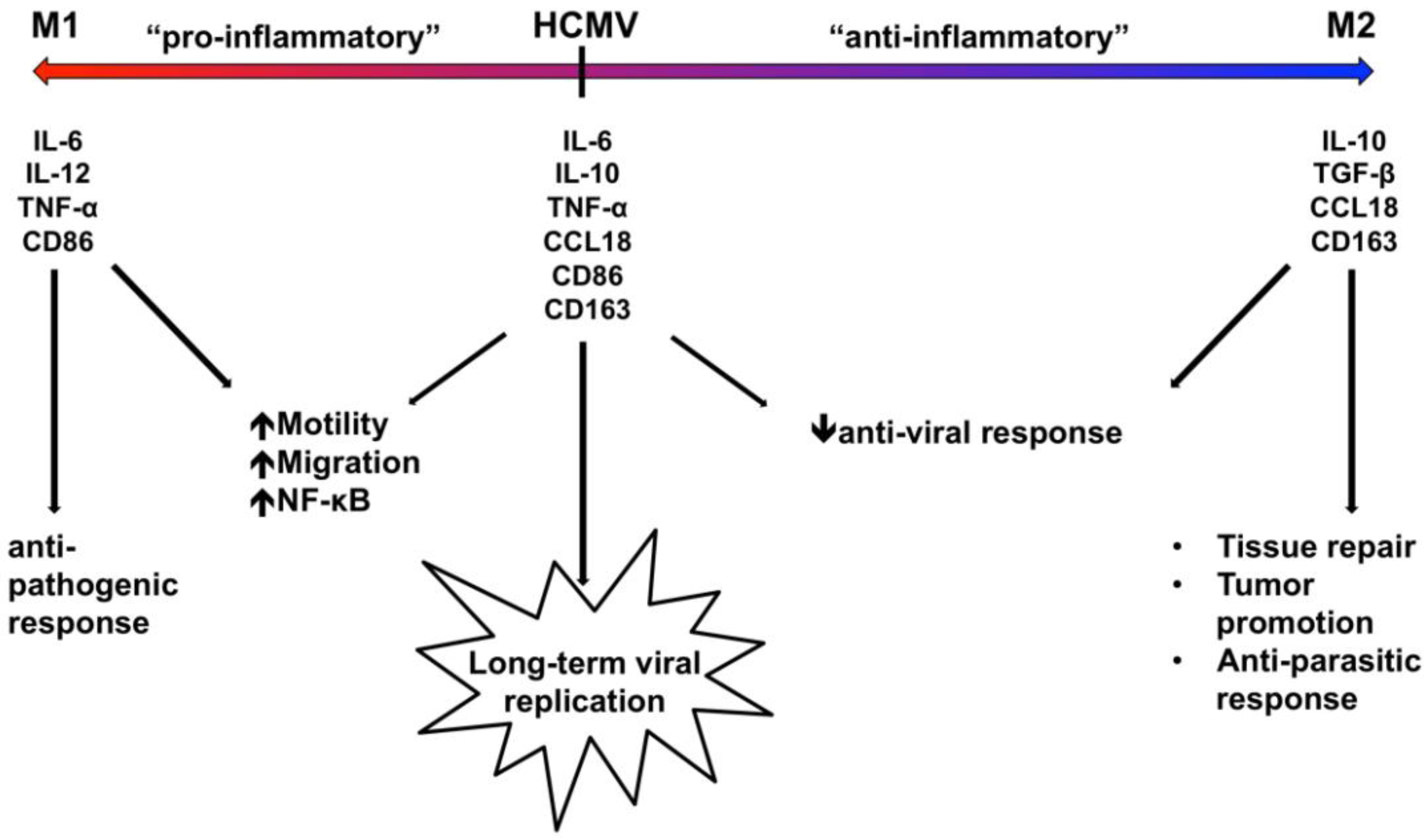 HCMV polarizes infected monocytes/macrophages towards a distinct phenotype possessing aspects of both M1 and M2 macrophages in order to promote viral spread and replication. Our current data indicate that HCMV induces the simultaneous expression of M1-associated molecules (IL-6, TNF-α, CD86) and M2-associated molecules (IL-10 and CD163), suggesting that HCMV-infected macrophages fall somewhere along the macrophage polarization continuum between an M1 and M2 phenotype (with a skewing towards a more M1-like phenotype) with an expression of more M1-associated genes and chemokines than M2-associated genes and chemokines [78,79]. We propose that through tight regulation of the expression of specific M1 (pro-inflammatory) and M2 (anti‑inflammatory) macrophage markers and chemokines, HCMV is able to utilize key pro-viral aspects of both polarization phenotypes, while simultaneously avoiding potential detrimental anti-viral effects. Specifically, HCMV likely utilizes M1-associated macrophage markers and chemokines to promote the pro-inflammatory activation of infected monocytes/macrophages to ensure proper cellular motility, migration, and monocyte recruitment, while utilizing M2-associated macrophage markers and chemokines to dampen the tissue-damaging effects of the pro-inflammatory response and any potential anti-viral responses. Overall, through the precise regulation of macrophage polarization, HCMV likely induces an ideal cellular environment that can support effective long-term viral replication, which ensures the overall success of the viral spread and persistence strategy.