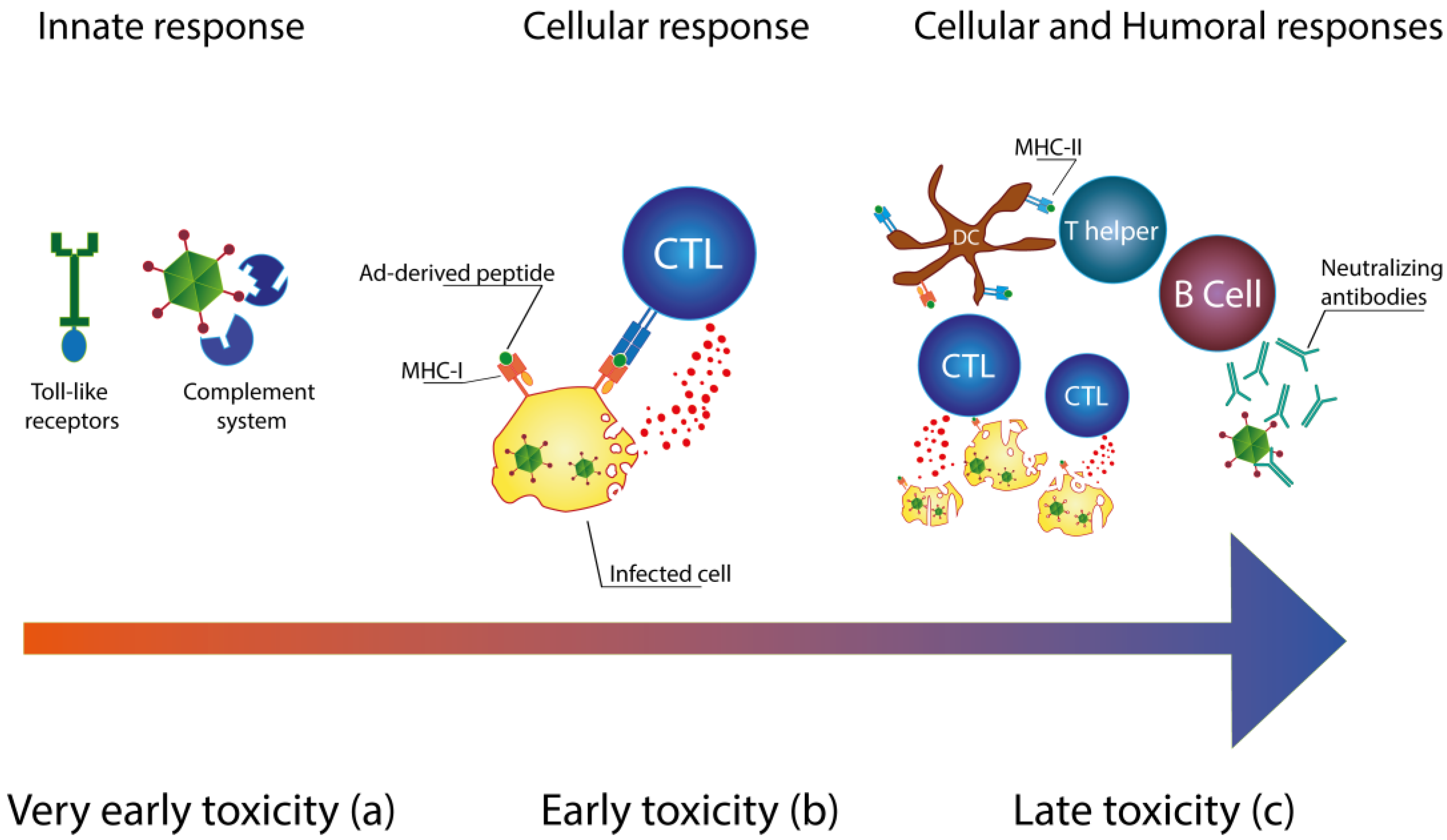 Activation of the cellular response typically occurs from three to seven days after the injection (Figure 1b). During this phase, the early toxicity is mainly mediated by the activation of cytotoxic T-lymphocytes (CTLs). Viral proteins produced in infected cells are processed and presented as peptides on the major histocompatibility complex (MHC)-I [20]. CTLs recognize these cells and lyse them [21]. In addition, mature CD4+ T cells can also contribute to the elimination of adenovirus-transduced hepatocytes [22]. At high viral loads, the liver inflammation can progress to severe hepatic necrosis and systemic inflammatory response syndrome [5].