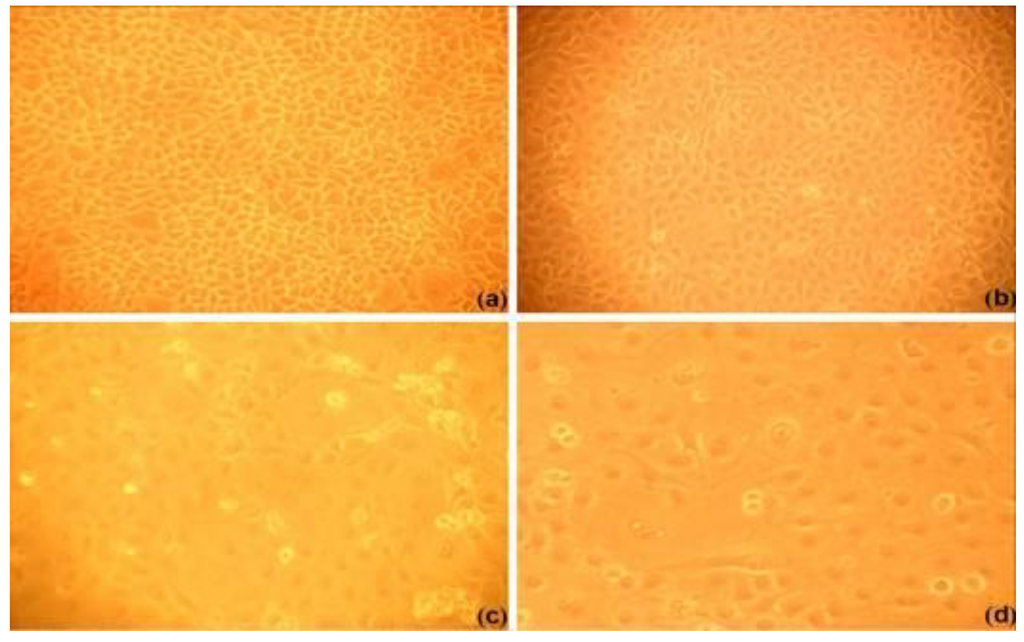 Optical microscopy photographs of cultured MARC-145 cells (×100). The cells were incubated with (a) cell culture medium (control group), and either 17.95 μM (b), 287.20 μM (c), or 1148.80 μM (d) EGCG palmitate.