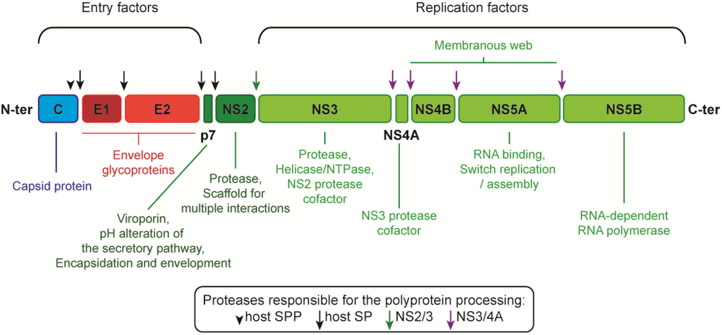 HCV belongs to the hepacivirus genus, which together with the flavivirus, pestivirus, and pegivirus genera constitutes the Flaviviridae family. Members of the Flaviviridae family share a common genomic organization. Their short positive-strand RNA genome encodes a single polyprotein, which serves as a precursor for the structural and non-structural proteins. In the case of HCV, the 3000-aminoacid-long polyprotein is cleaved into 10 mature products: the structural proteins core, E1 and E2, and the non-structural (NS) proteins p7, NS2-3-4A-4B-5A-5B (Figure 1). NS3 to 5B are necessary and sufficient for the viral RNA replication [4]. They are also involved, together with p7, NS2 and the structural proteins, in the assembly of progeny virions [5]. This extensive participation of non-structural proteins in the virion assembly process is a common feature of the Flaviviridae [6].