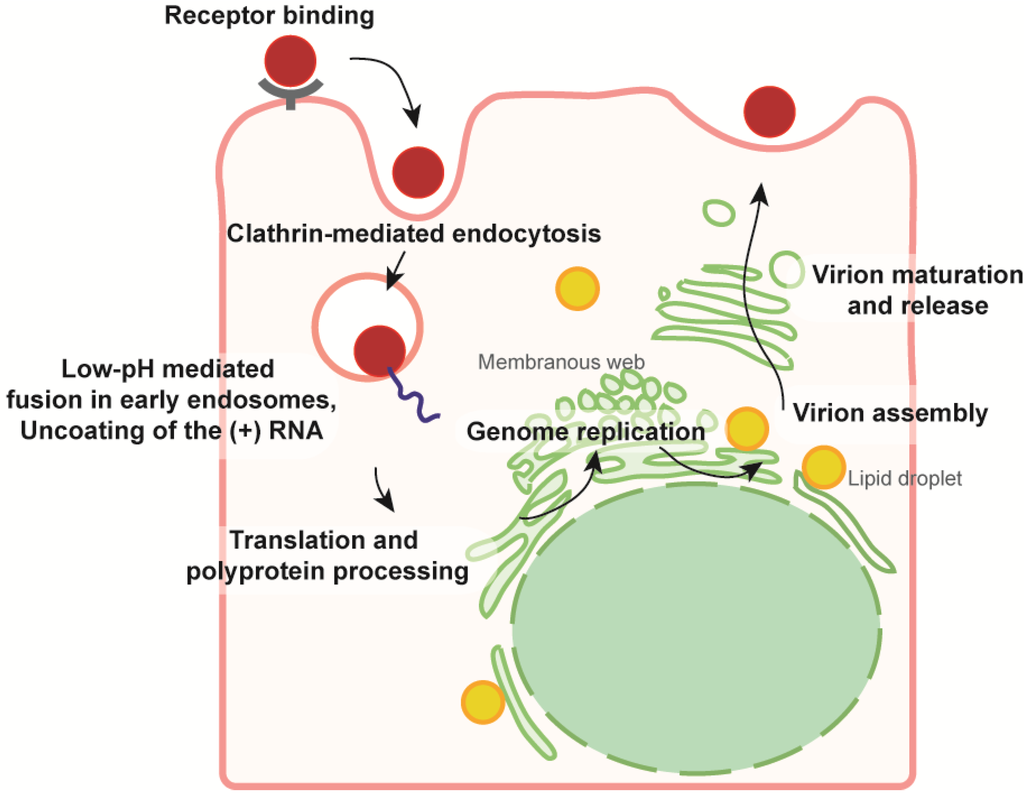 The HCV replication cycle is summarized in Figure 2. Briefly, HCV binds and enters the cell in a multistep process involving numerous host receptors and co-receptors (for a review on HCV entry, see for instance [7]). Internalization occurs via clathrin-mediated endocytosis, which guides the virion towards early endosomes, where fusion is triggered by pH acidification. Once in the cytosol, the genomic RNA is translated into a polyprotein. The mature gene products carry out RNA replication, in association with ER- (endoplasmic reticulum) derived membranes, and the assembly of progeny virions, which travel through the secretory pathway before secretion and infection of naive cells.